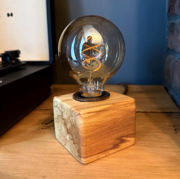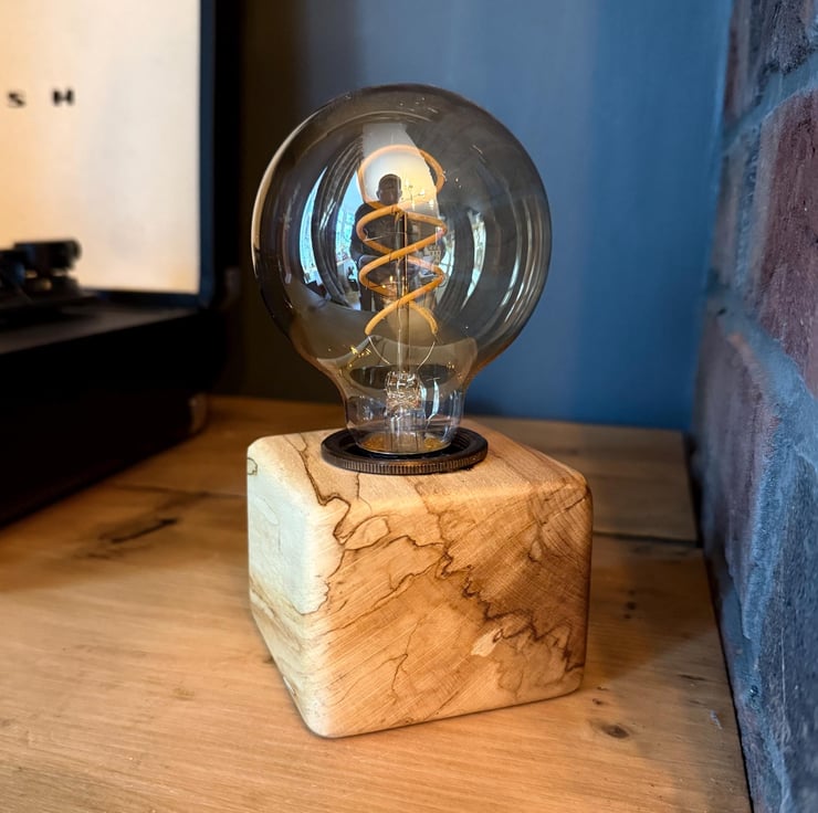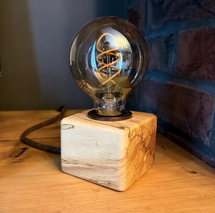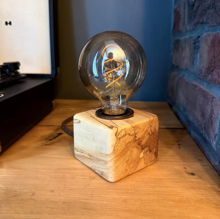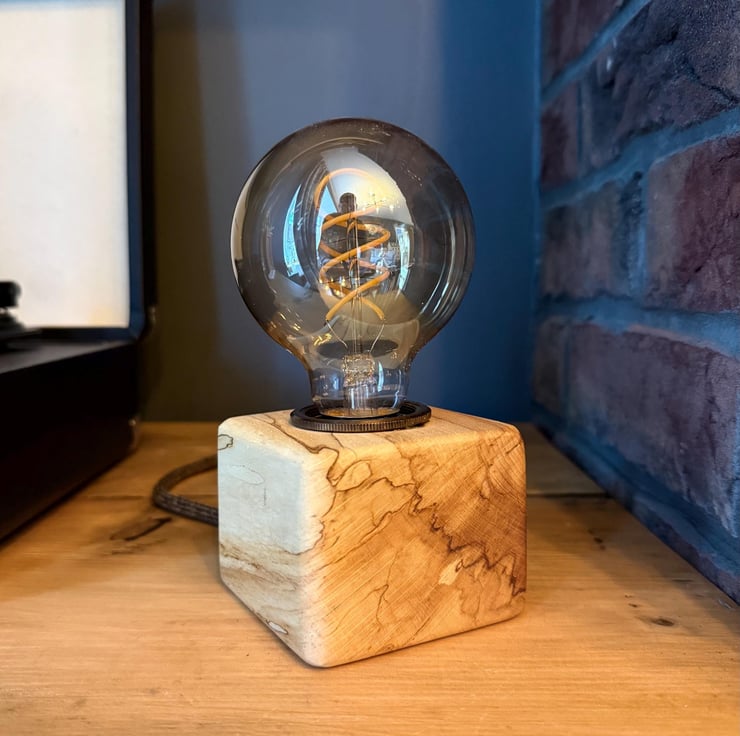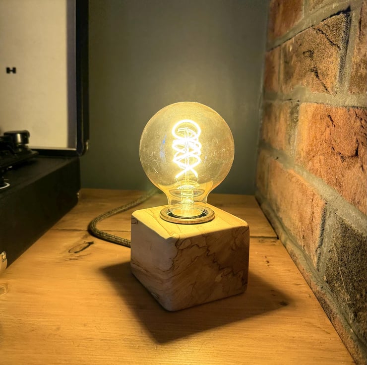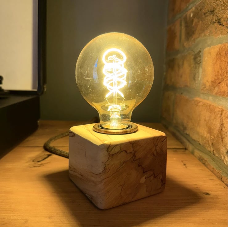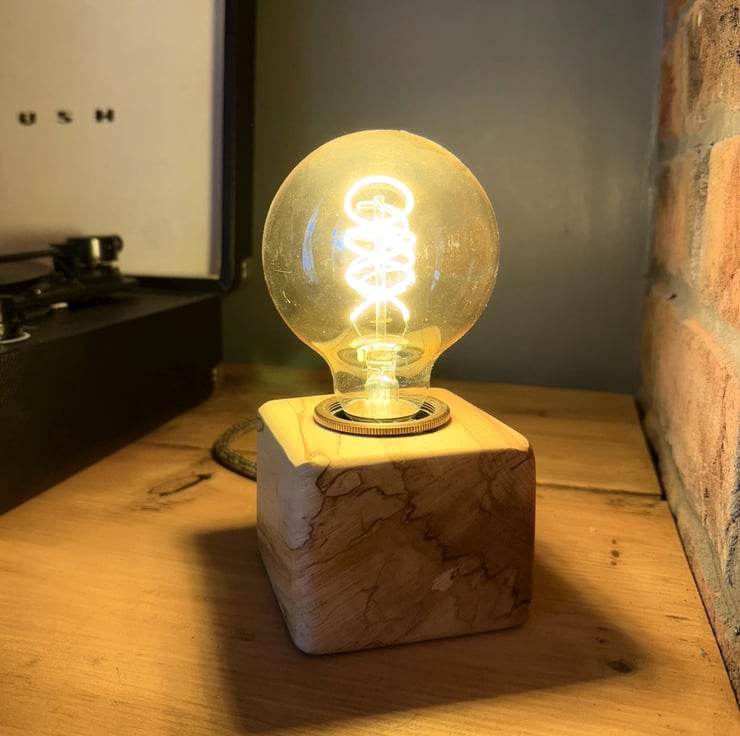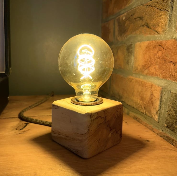 Made from solid Spalted Beech Wood. Fitted with 2M Brown marl wool coloured fabric cable with inline switch. With optional round E27 Vintage style Spiral LED Edison bulb