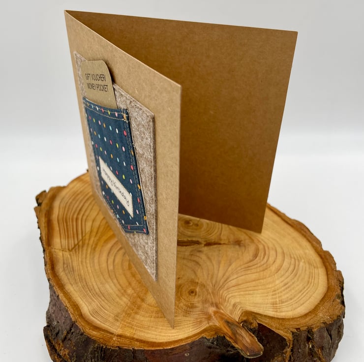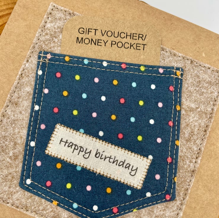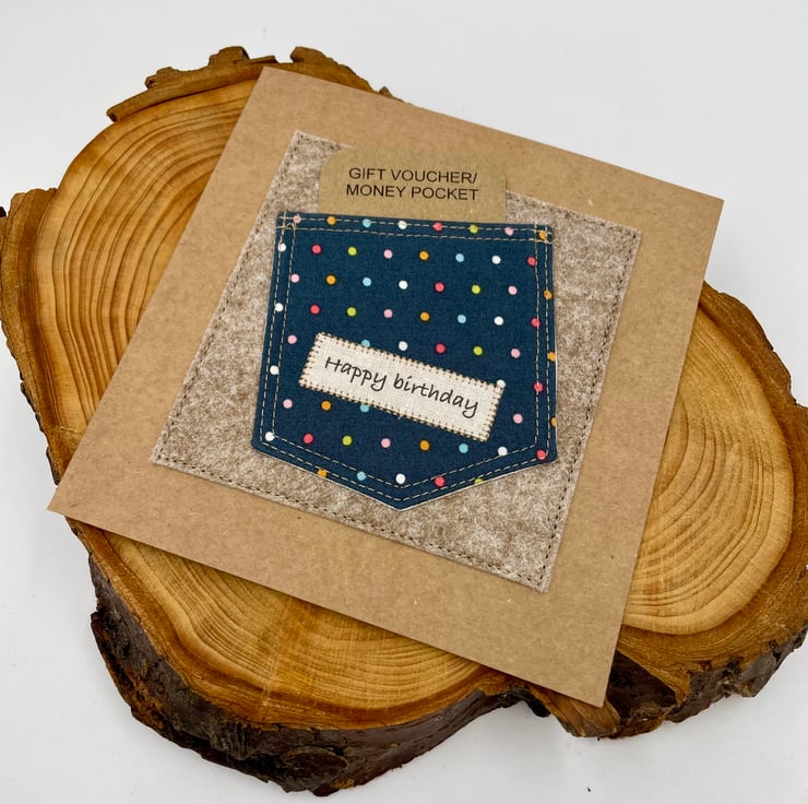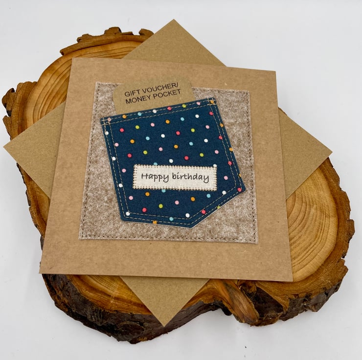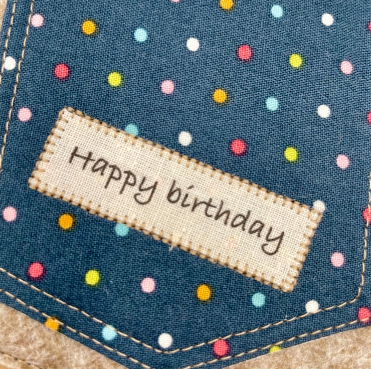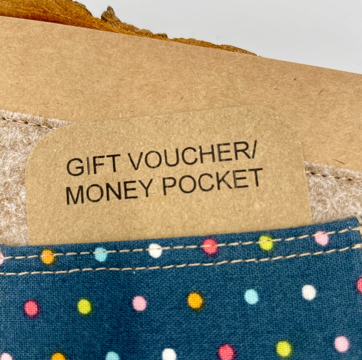 Here's a little something stitched with love and a sprinkle of cheer! This charming birthday gift pocket is as thoughtful as it is unique—crafted from soft beige wool felt and recycled card, with a cheerful 'Happy Birthday' message dancing across a sea of multicolored dots on a blue backdrop. Perfect for tucking in a gift voucher or a little birthday treat, it’s a sweet way to send your best wishes, wrapped up in cozy, homespun charm!