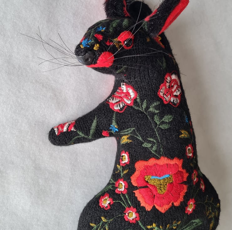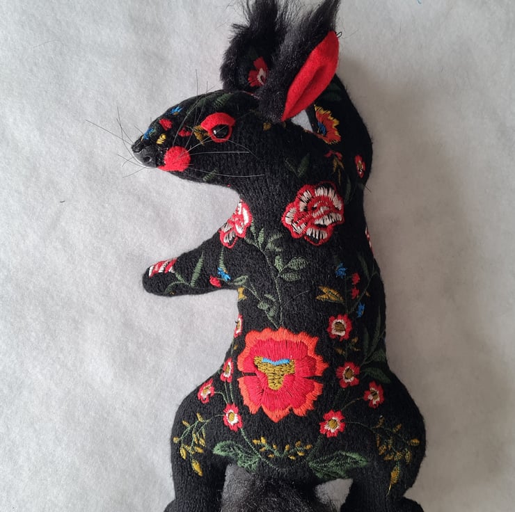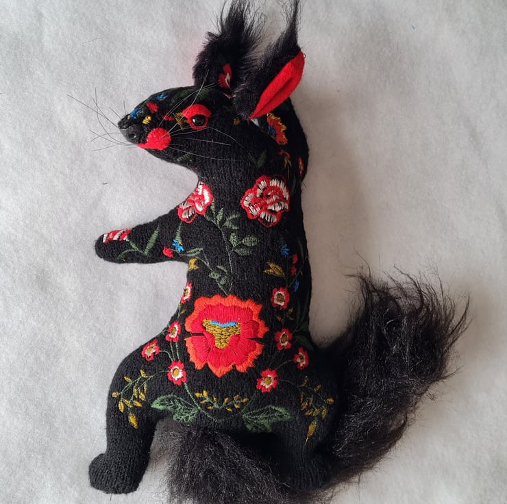 A lifesize faux squirrel I have handmade and covered in hand stitched and machine embroidered black fabric. He has ear tufts and a fluffy tail made from long faux fur.