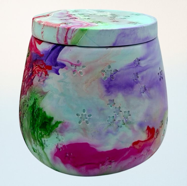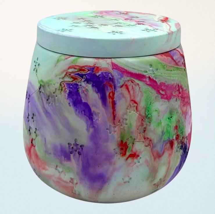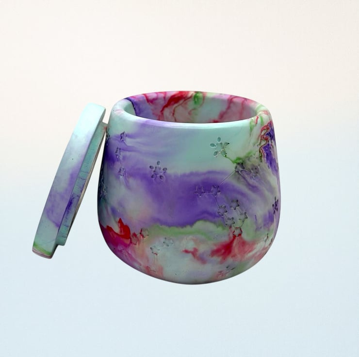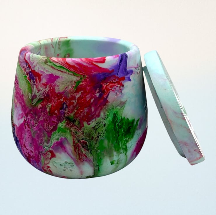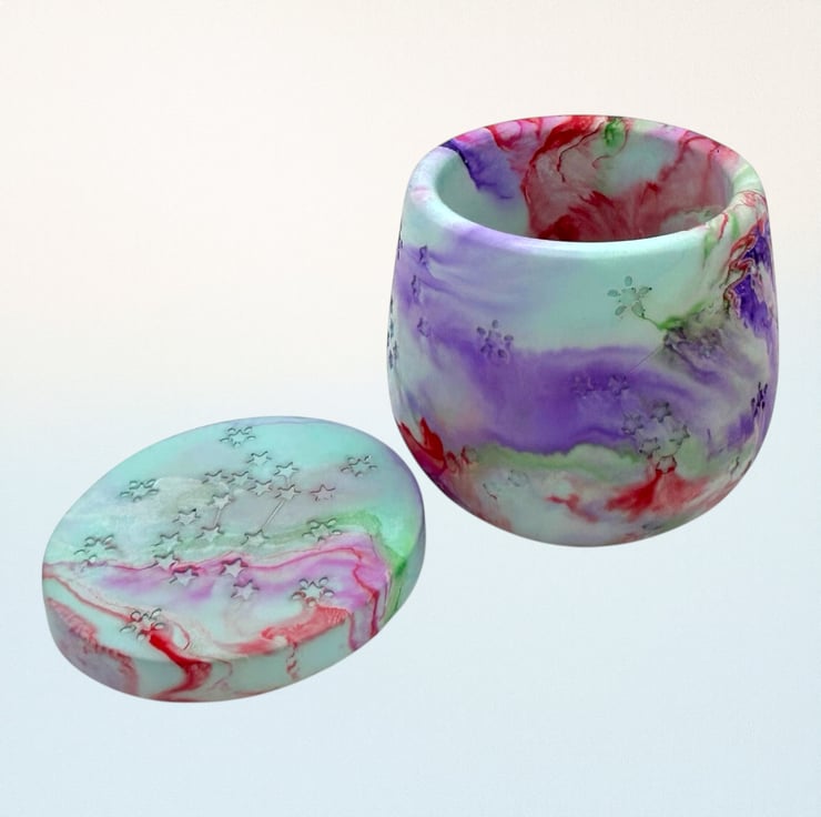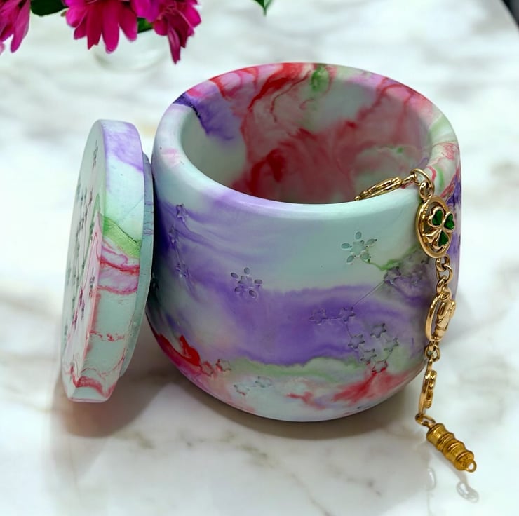This enchanting green, pink, and lilac jewellery box beautifully captures the essence of the Aurora Borealis with its unique abstract marbling pattern. The subtle green glitter that weaves through the marbling adds a lovely shimmer reminiscent of the auroras dancing in the night sky.