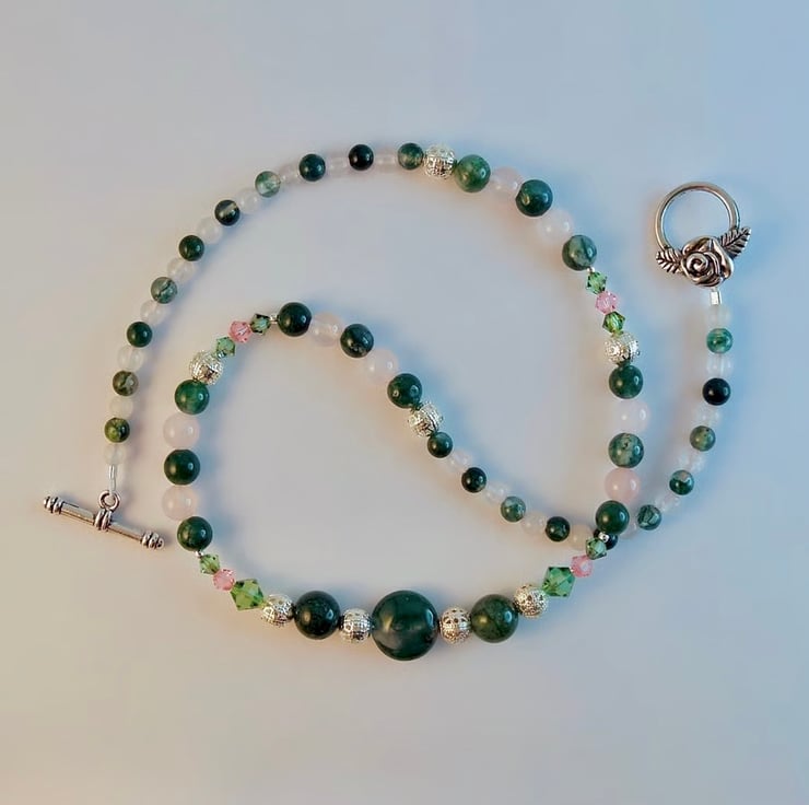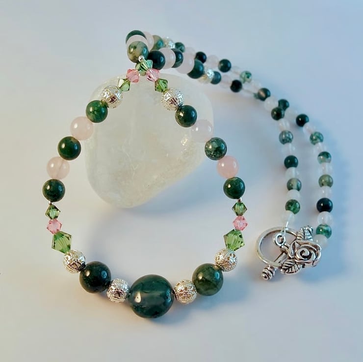 Moss Agate, Rose Quartz & Crystal Necklace, Anniversary, Birthday, Gifts For Her