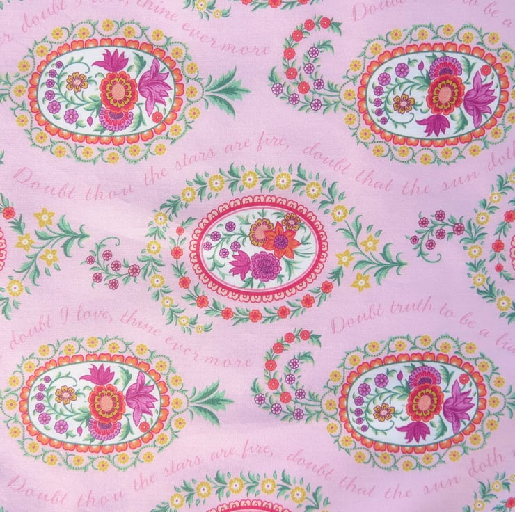 Love Poem draws inspiration from a miniature hand-painted artwork found within the pages of an archival pattern book dating back to the 1820s. Arranged in and around oval shaped botanical vignettes, its delicate blooms feature Persian-style flowers including tulips, chrysanthemums, and carnations. Take a closer look to discern the subtle words of a romantic love poem, gracefully woven amidst the elegant motifs.