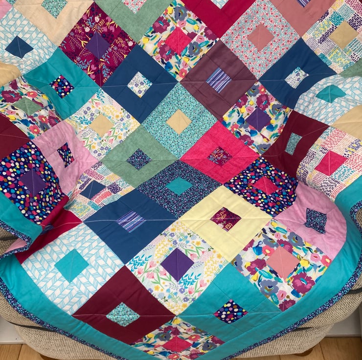Vibrant multi-coloured patchwork throw/quilt. Handmade using cotton fabrics for top and backing and cotton batting in the middle. The backing is plain pink.