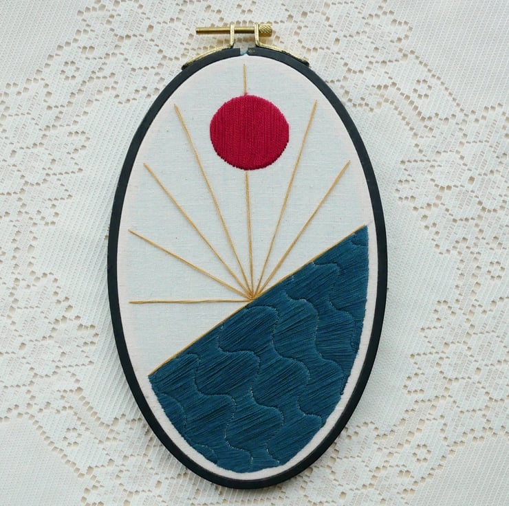 Summer By The Sea is an original embroidery art piece set in an oval hoop that has been painted black.