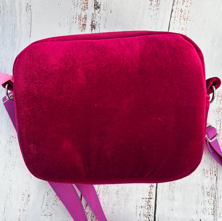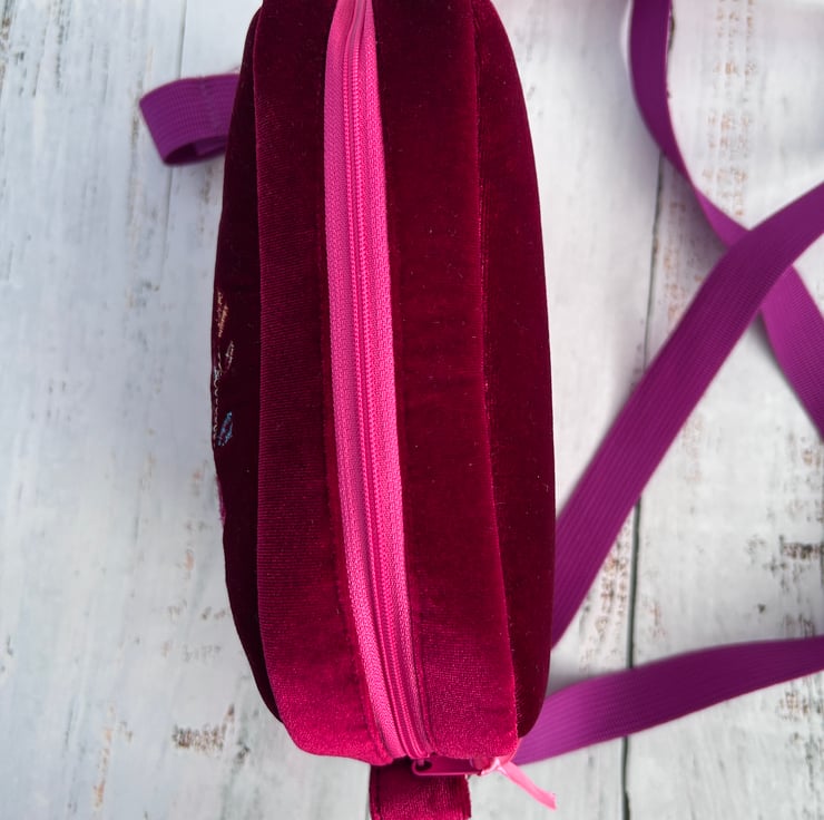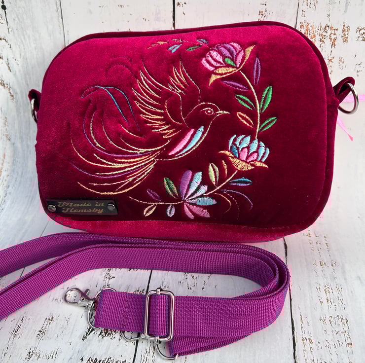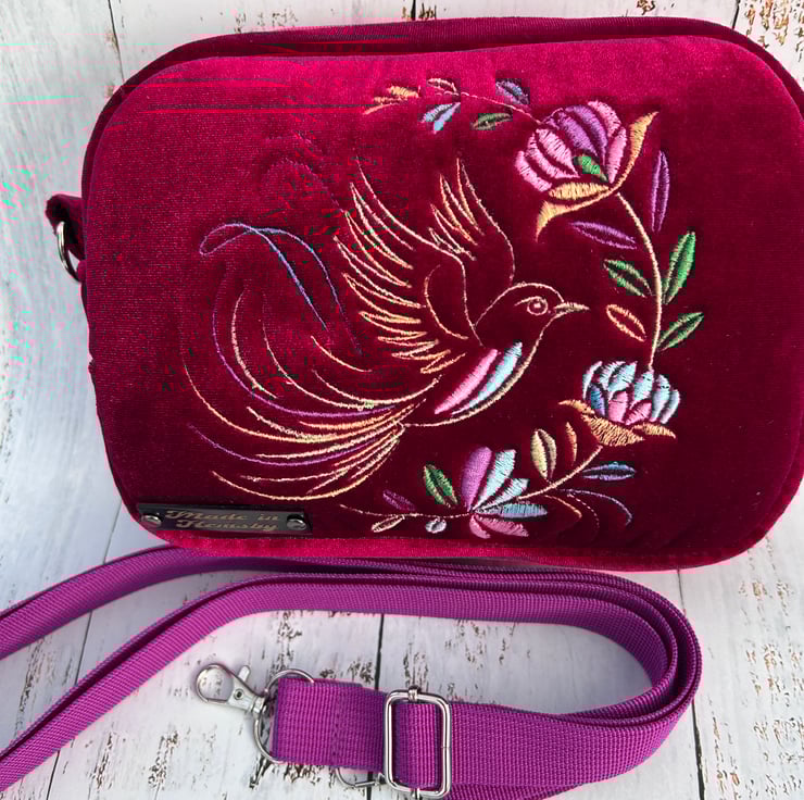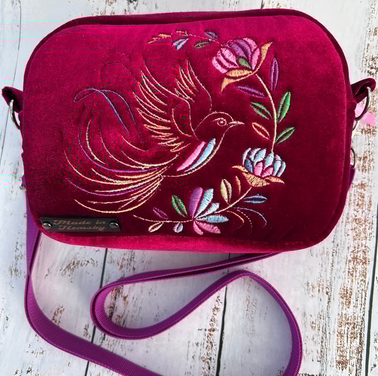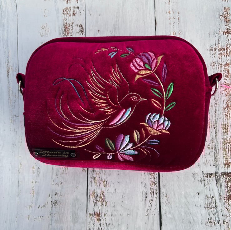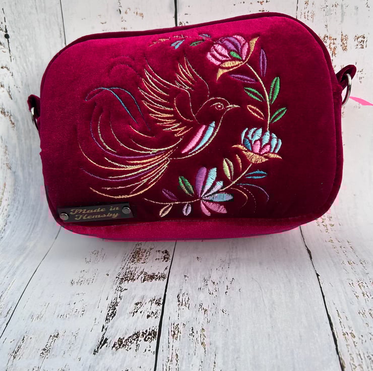 A lovely camera style cross body bag, created using a soft dark pink velvet fabric, lined in a patterned cotton fabric. The bag is embroidered with a bird on a floral branch.