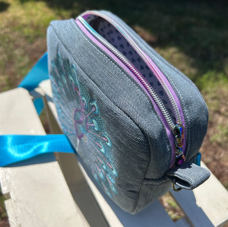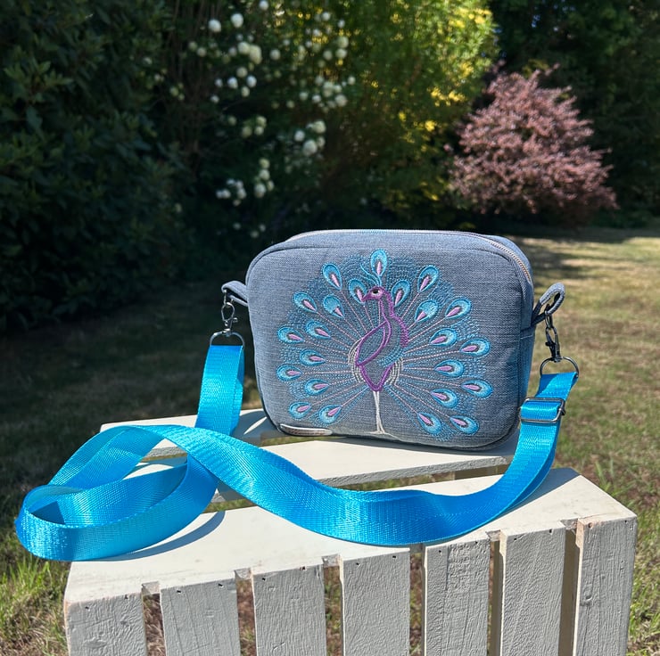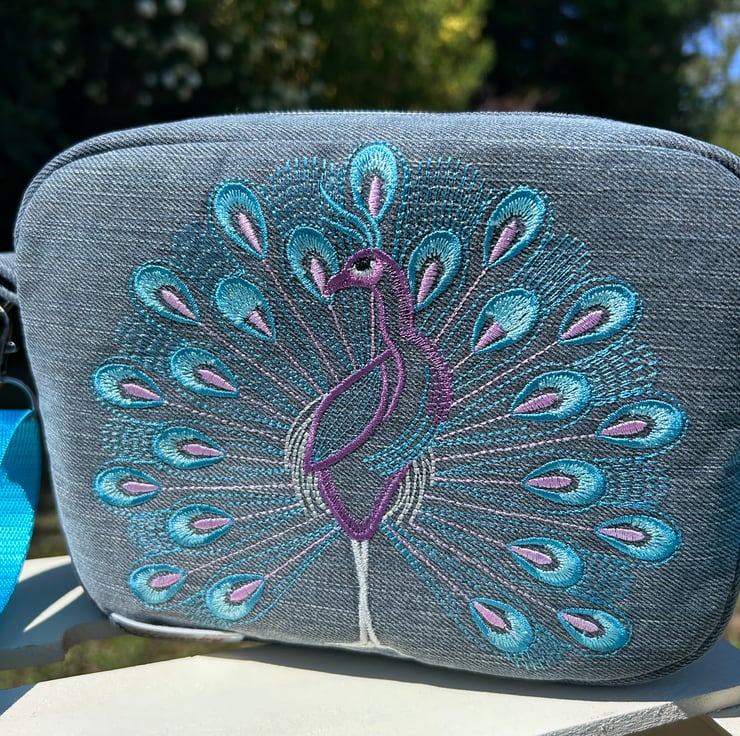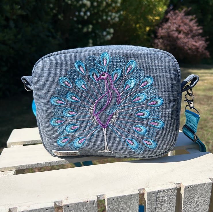 This really versatile and stylish bag is created using upcycled denim, lined in a patterned cotton fabric. The bag is embroidered on one side with a splendid peacock using a blue and lilac colour palate.