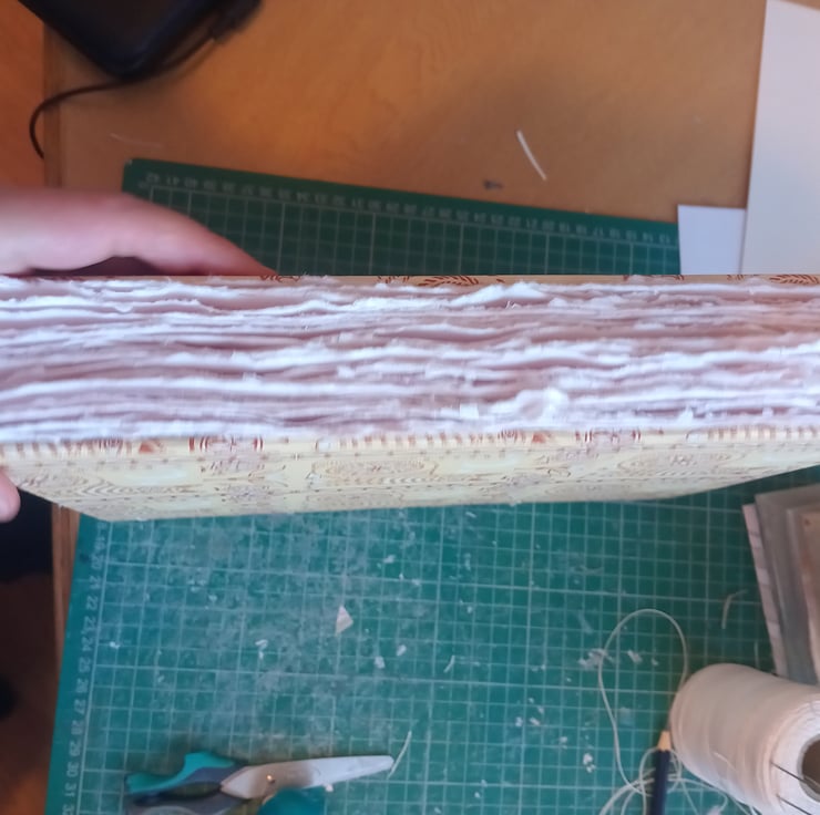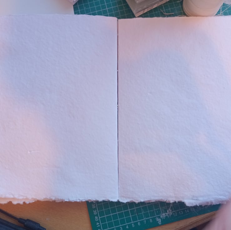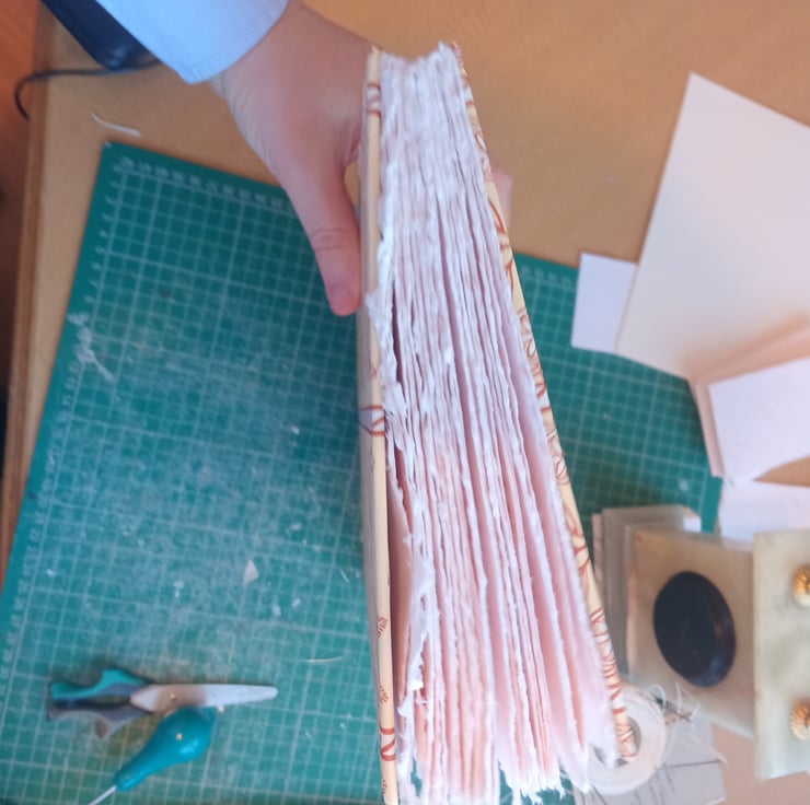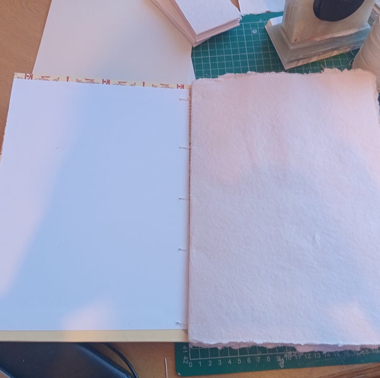 Handmade Sketchbook with indian cotton rag watercolour hand torn to size and stitched with ab open spine coptic stitch. Hadcovee with cat blockprint decorative italian paper.