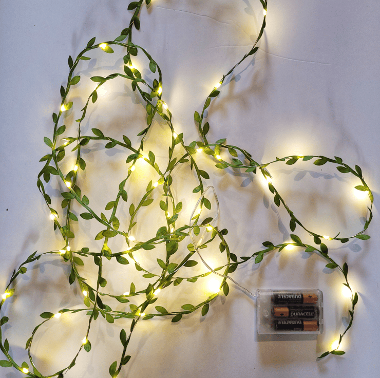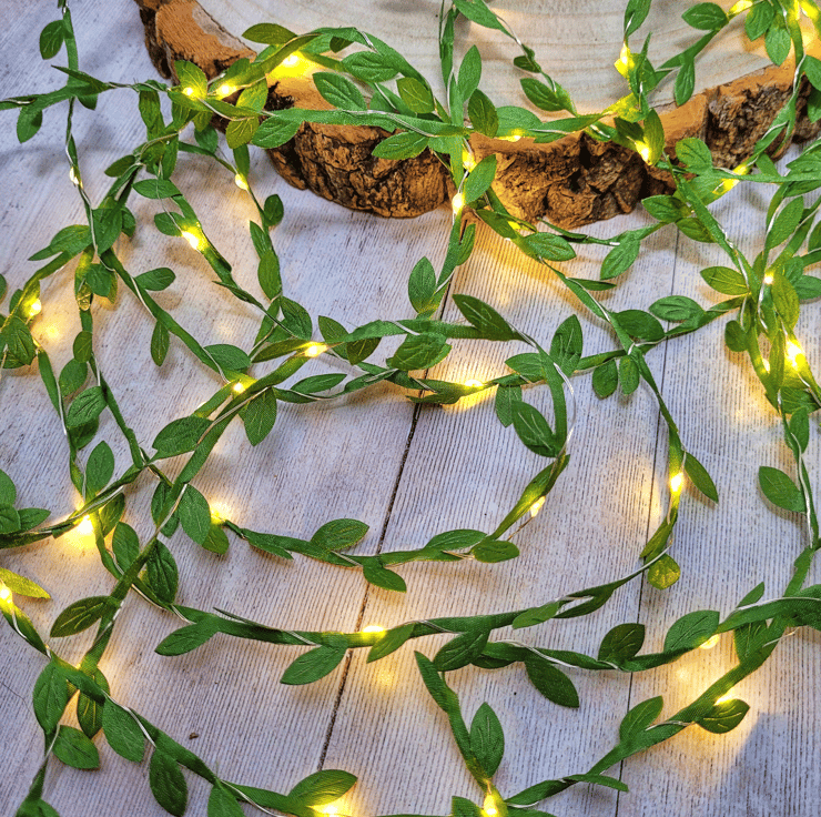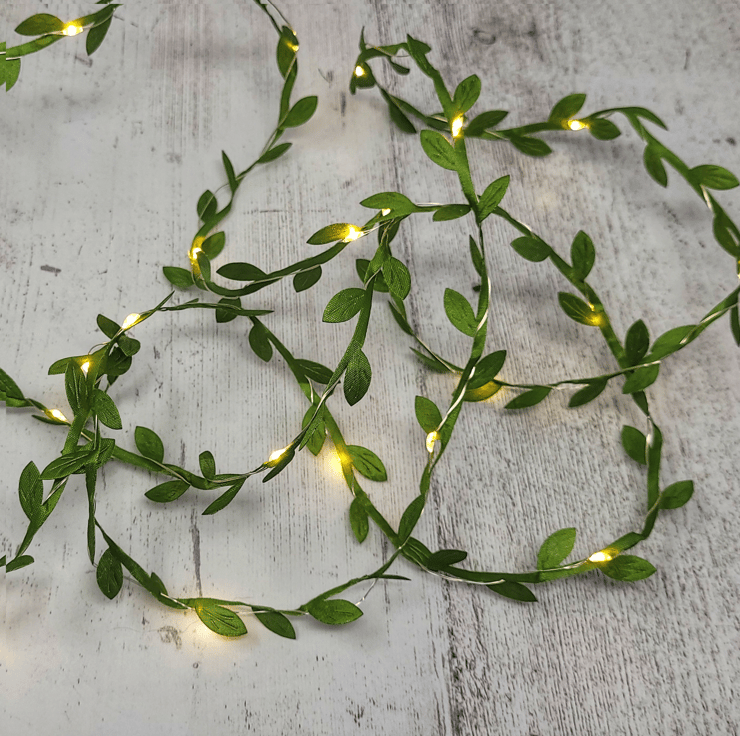 This green leaf fairy light garland with warm white mini LEDs is perfect for your home, wedding or event decor.