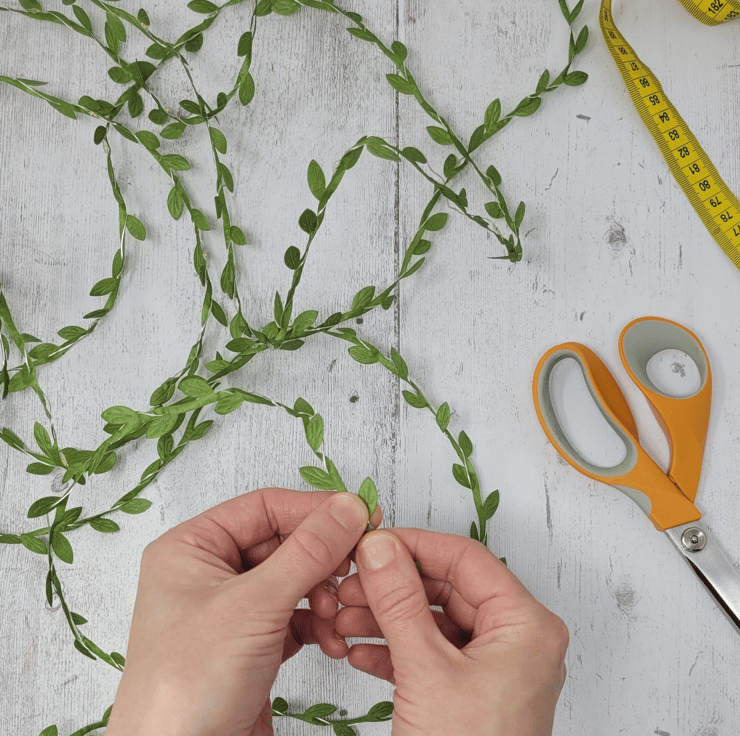 Mini LEDs have been embedded into silver wire, which has been delicately intertwined with this beautiful green fabric leaf garland