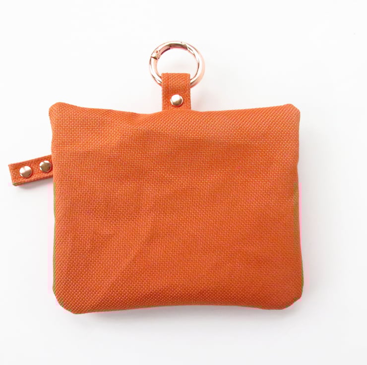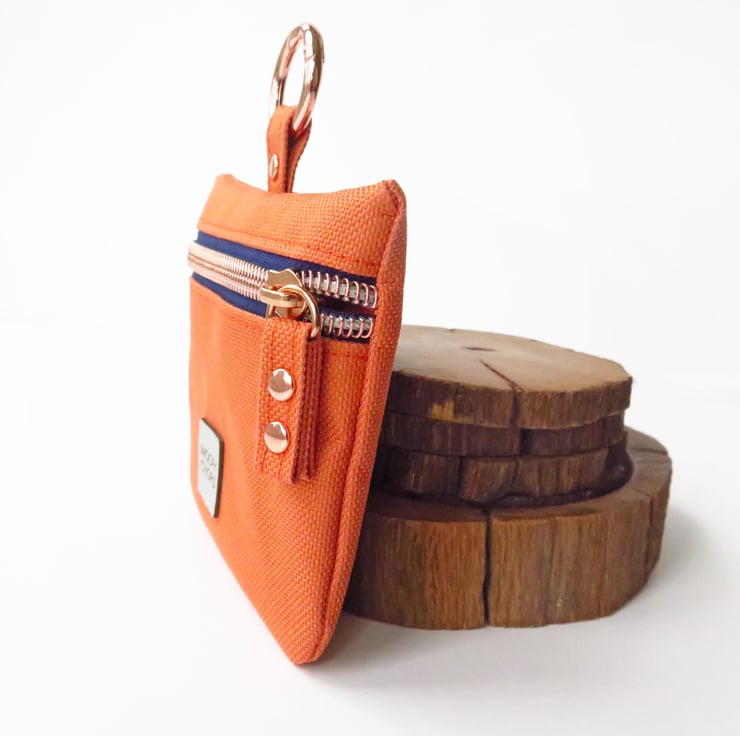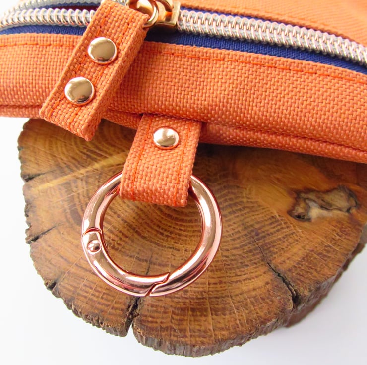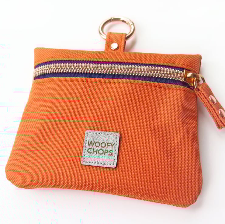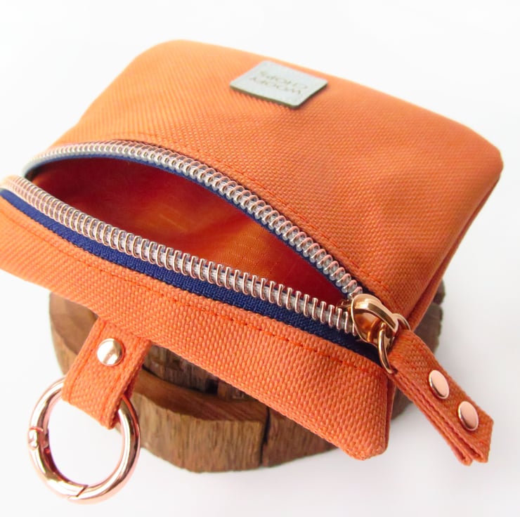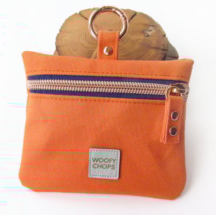 Orange Treat Bag with Rose Gold Hardware doggy treat bag. Has a French navy blue fabric zipper tape with rose gold teeth, rose gold rivets and carabiner.