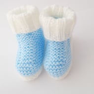 Hand knitted white baby booties with ribbed double layer cuffs to keep little feet warm, ideal new baby or baby shower gift or a novel pregnancy reveal idea