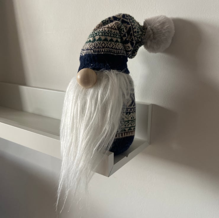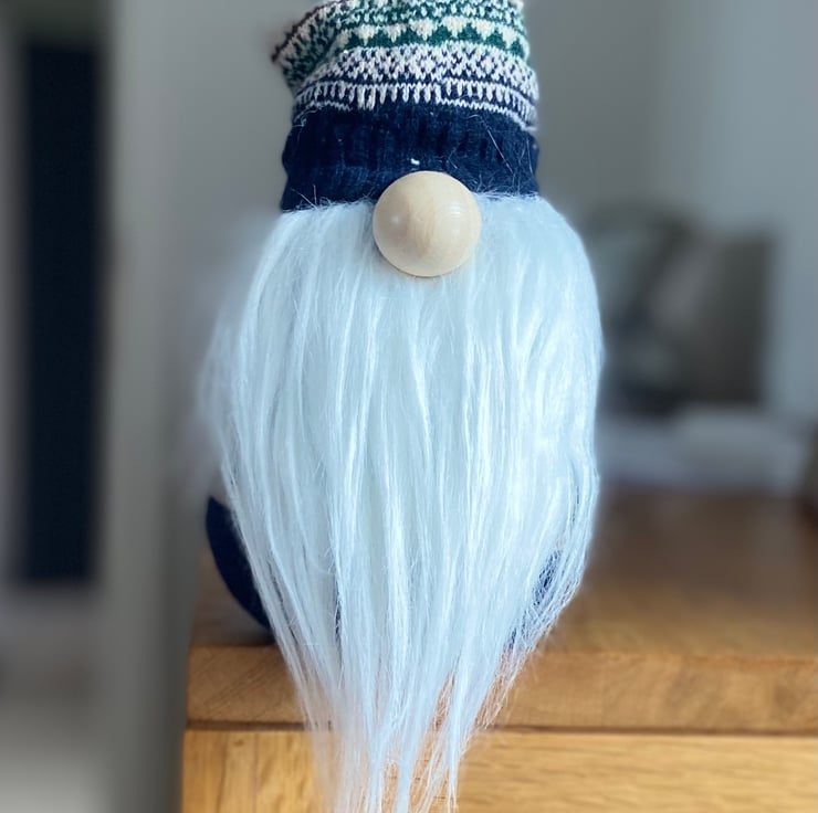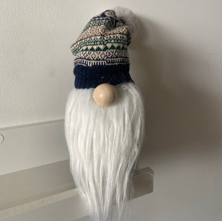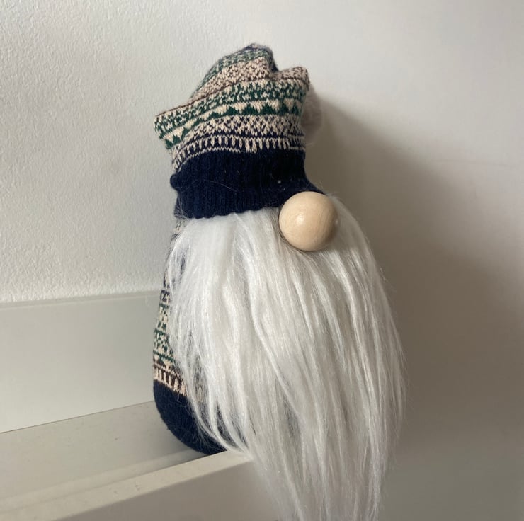 Charming handmade bearded sock gonk with body and hat in blue, grey and green pattern. With a large wooden nose and his long white beard he stands approximately 25cm in height and 8cm wide, the body is soft weighted so he’s able to stand on his own.