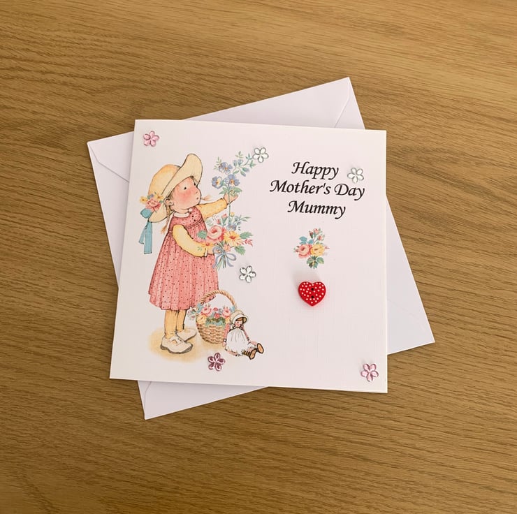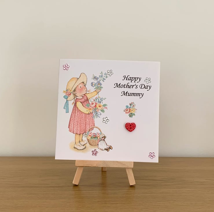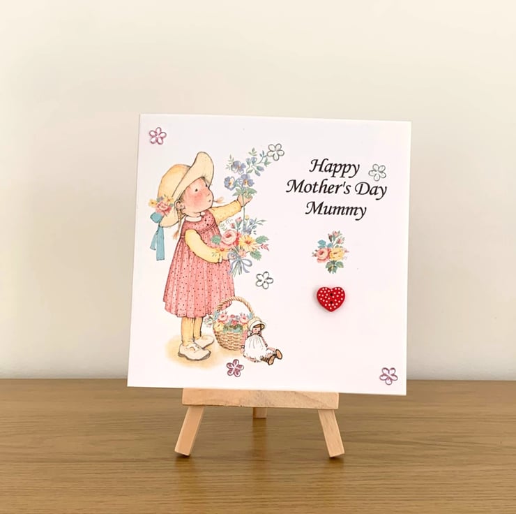 The card is embellished with acrylic flowers & a heart shaped button.