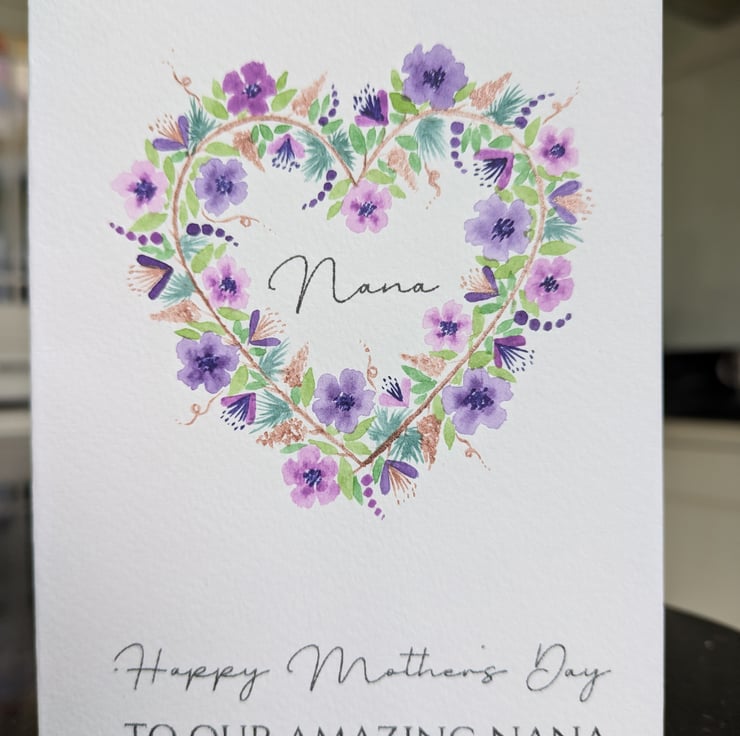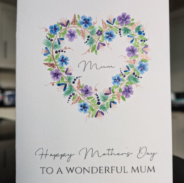 An intricately hand-painted heart-shaped wreath design which can be personalised both with a name in the heart, with your text on the front of the card and also a greeting inside. Painted using watercolours, some of which are metallic and shimmer beautifully in the light. A totally unique, thoughtful and special gift for your chosen recipient.