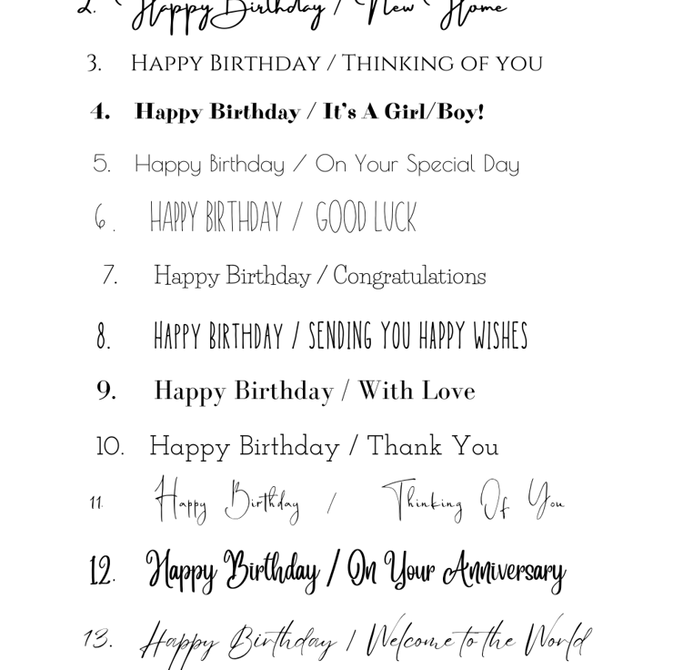 To personalise the item drop me a note with your chosen font(s) (see font list picture) and wording. You can also specify your chosen colour scheme (see colour scheme picture).