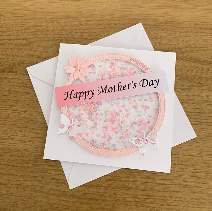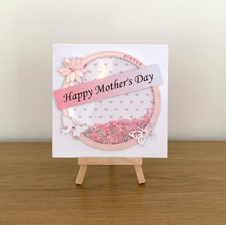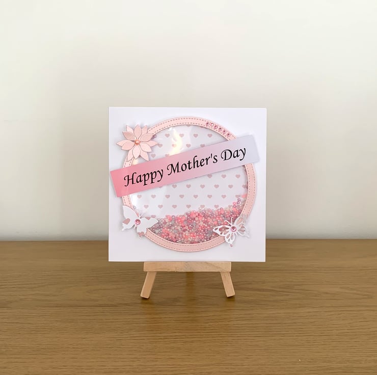 The shaker element has a pink heart background & has pastel pearls, sealed behind a clear plastic film.