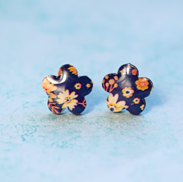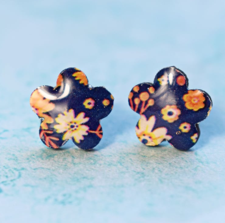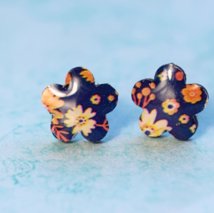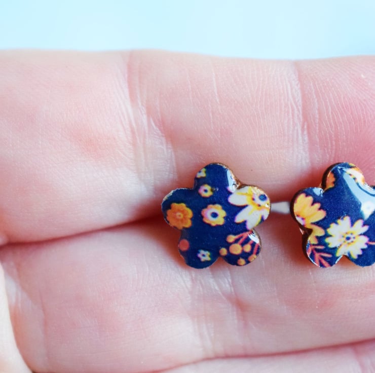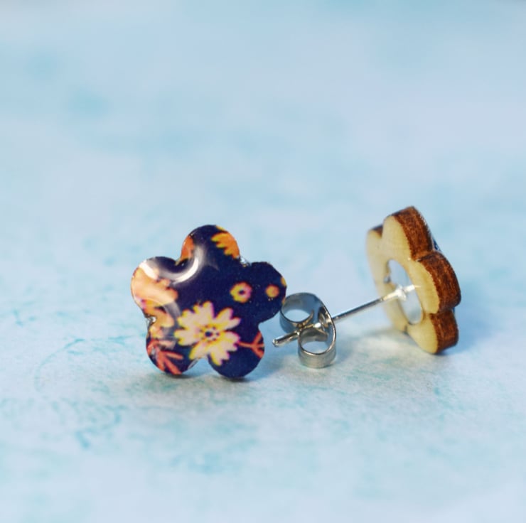 The base of the studs is wood and this has been decorated with a floral pattern on a deep blue background. I have coated this with clear resin to keep them looking glossy and fresh and the backs are given a coat of clear resin too. The posts are silverplated and the backs are stainless steel. If you are always losing earrings backs and would like to buy spares just message me and I can add them to your order.