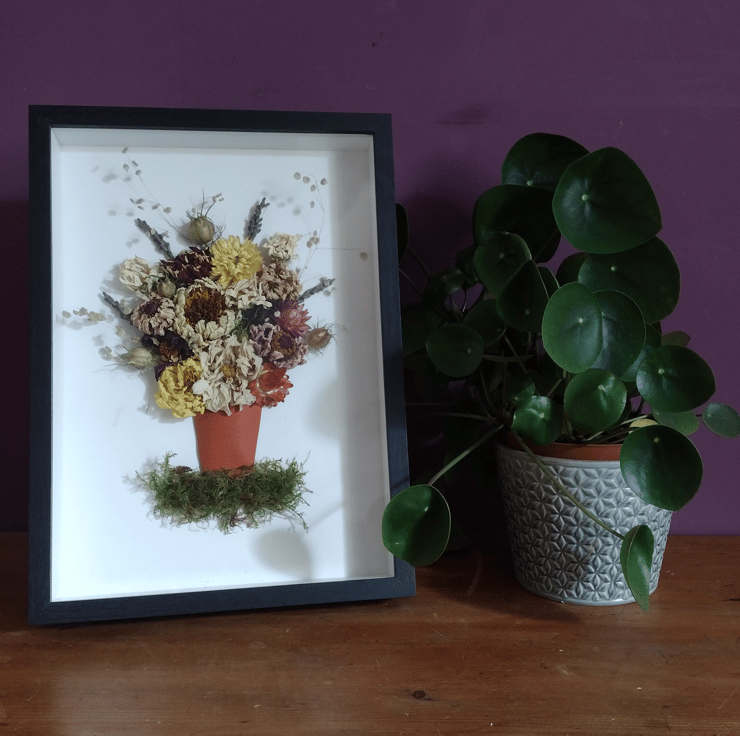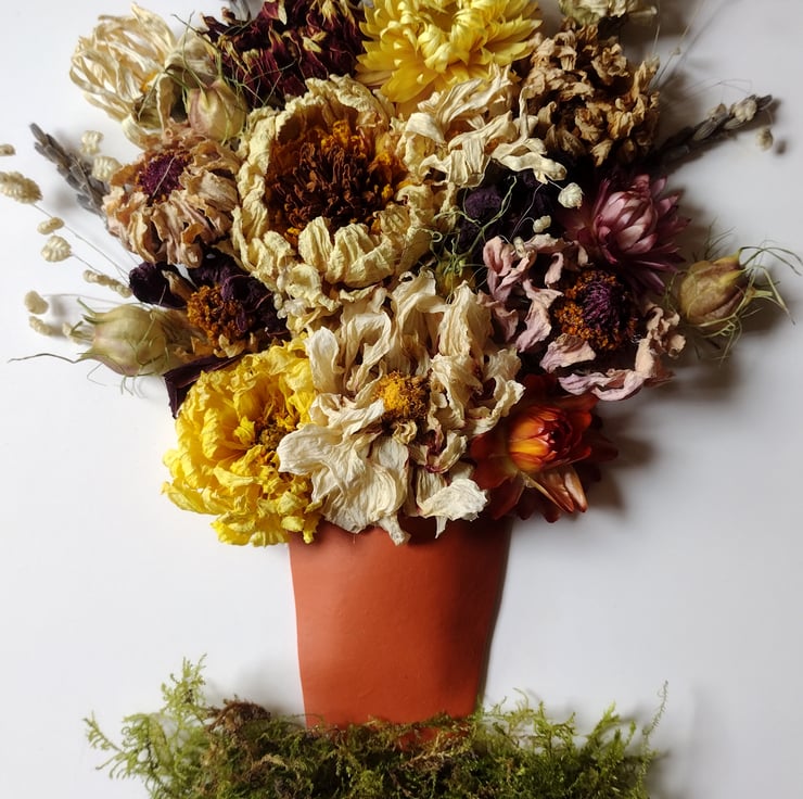 This piece shows a terracotta pot spilling over with an abundant display of beautiful flowers. It comprises dried flowers carefully arranged onto a white background, the pot is made from polymer clay, and it is all nestled on a fluffy bed of moss.