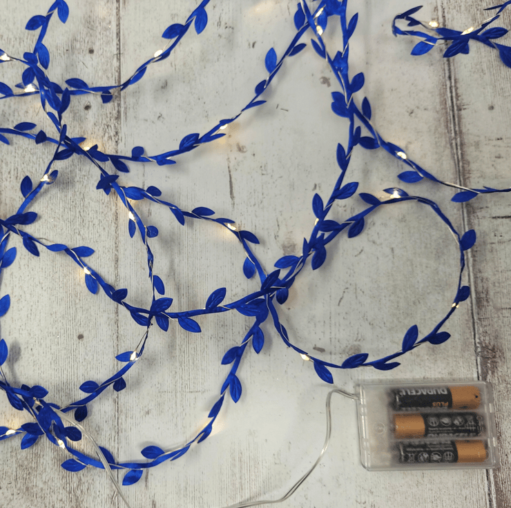 Mini LEDs have been embedded into silver wire, which has been delicately intertwined with this beautiful blue fabric leaf garland