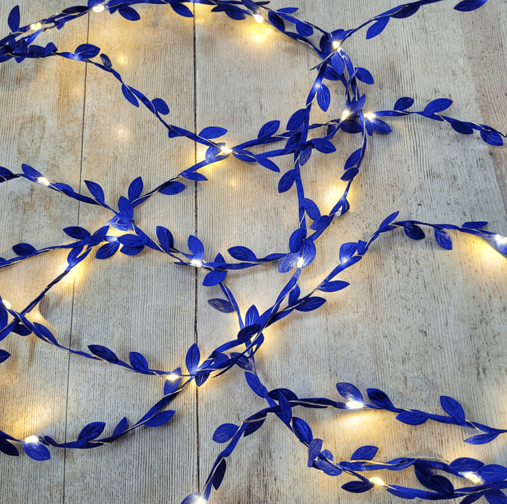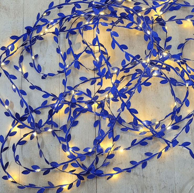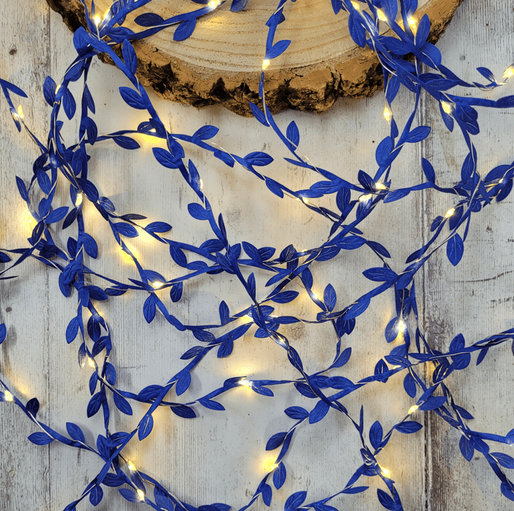 This blue leaf fairy light garland with warm white mini LEDs is perfect for your home, wedding or event decor.