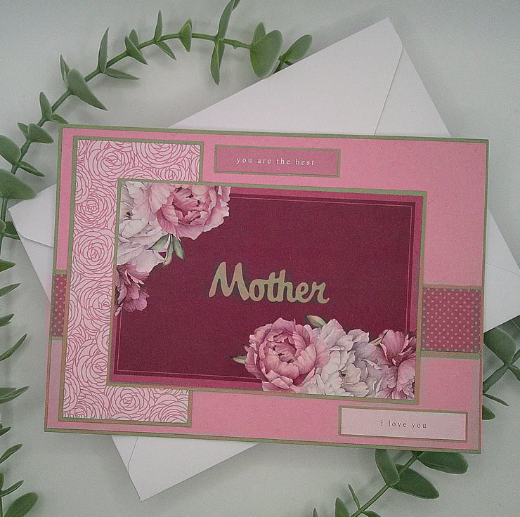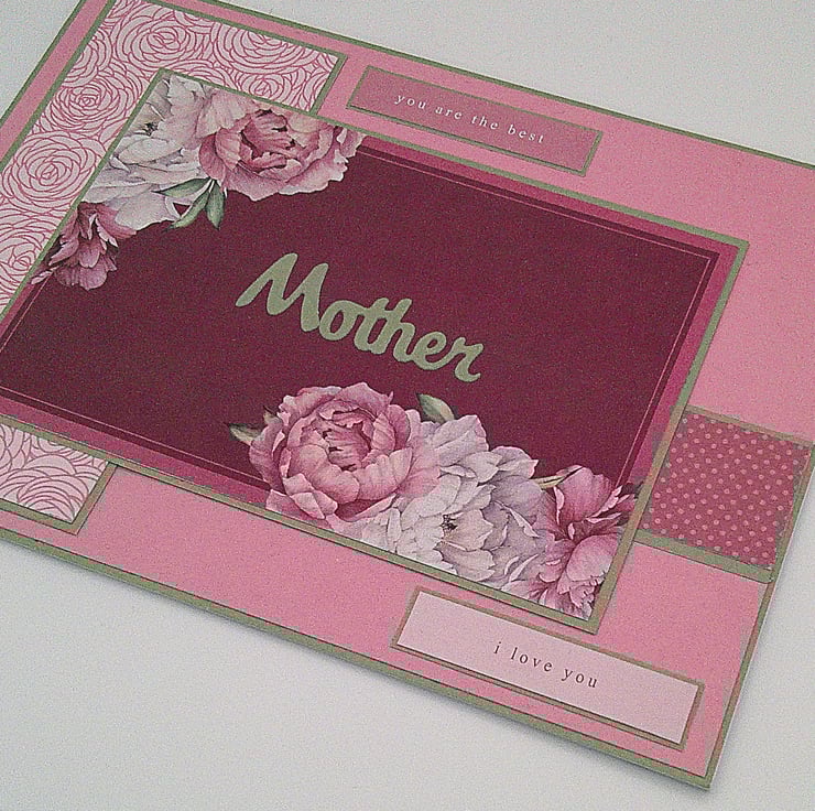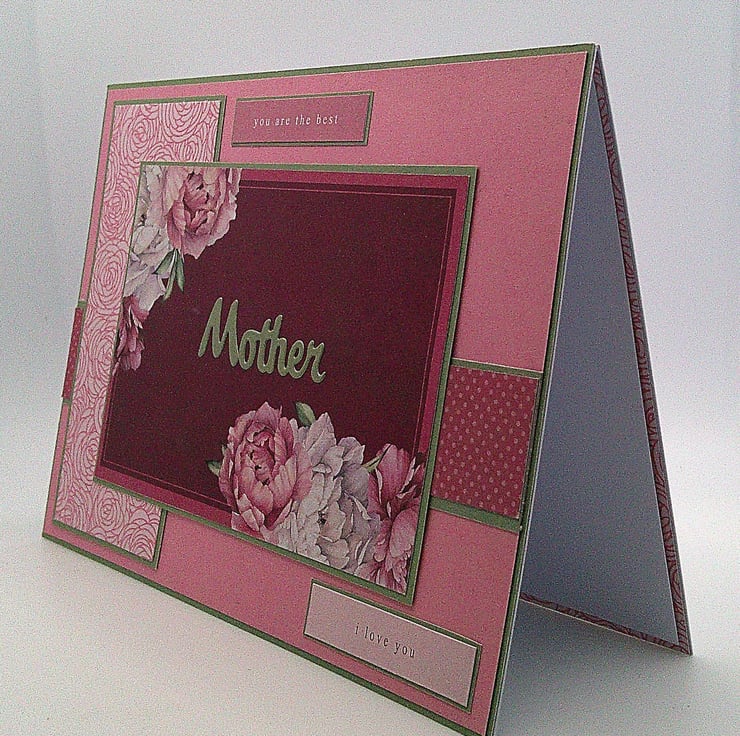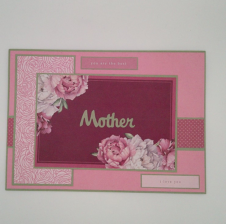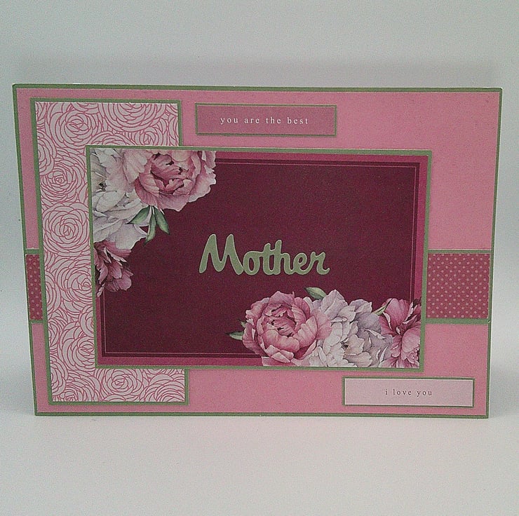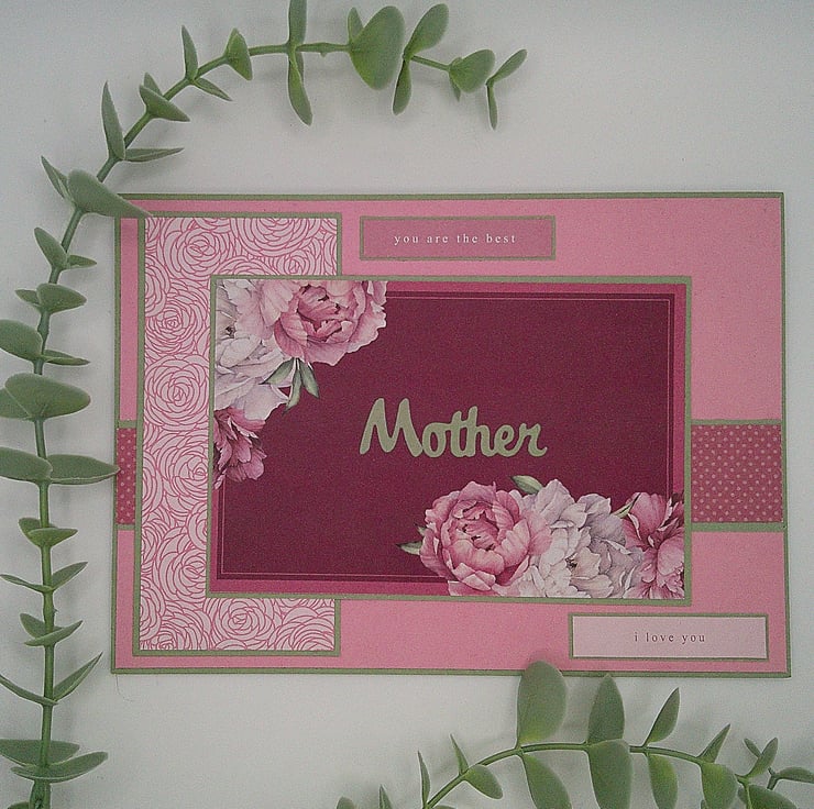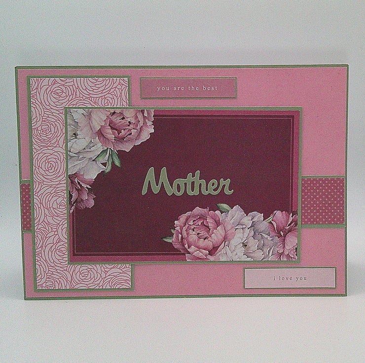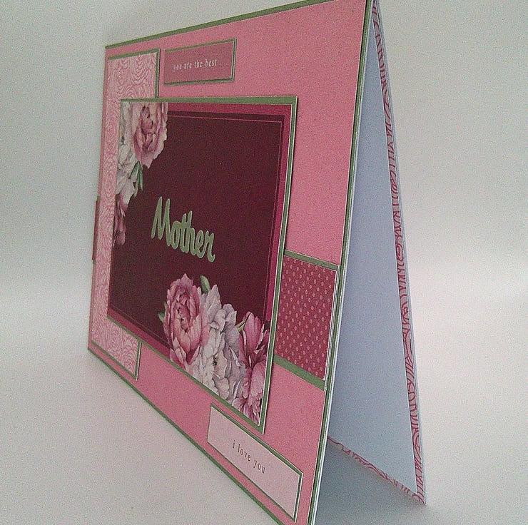 Measuring 5 x 7 inches, this handmade card has been created using complimentary tones of pink and burgundy patterned cards with a green accent.