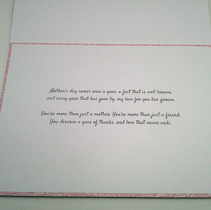 "Mother’s day comes once a year, a fact that is well known, and every year that has gone by, my love for you has grown. You’re more than just a mother. You’re more than just a friend.