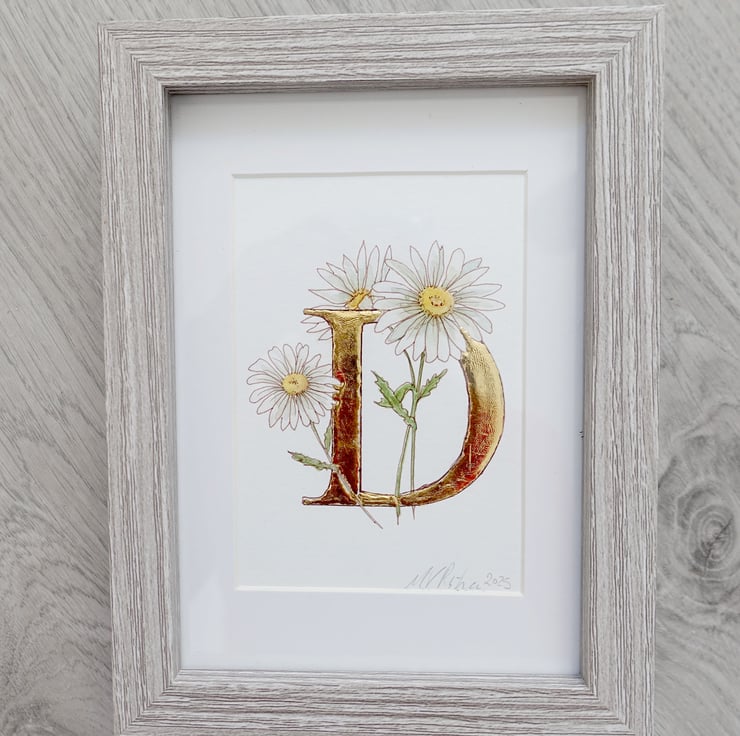 Small sized original watercolour art with 23.5 gold carat leaf letter D.