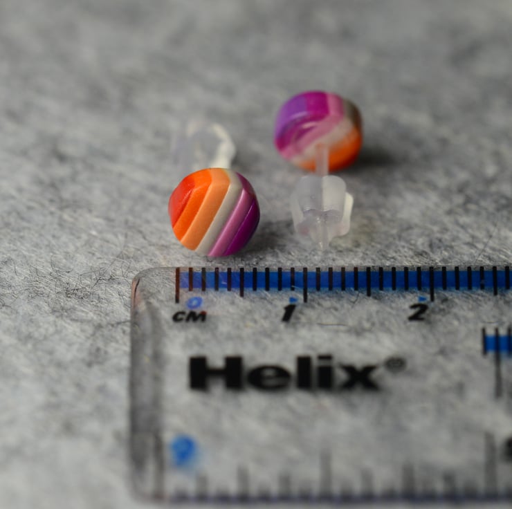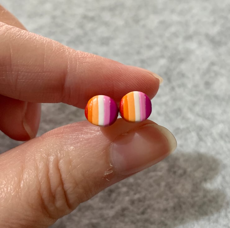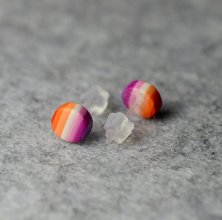 A pair of small lesbian pride earrings made from polymer clay, and on plastic posts.