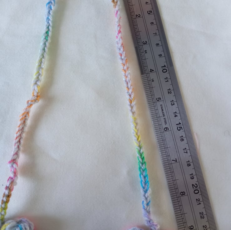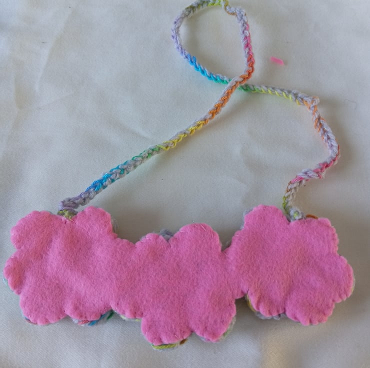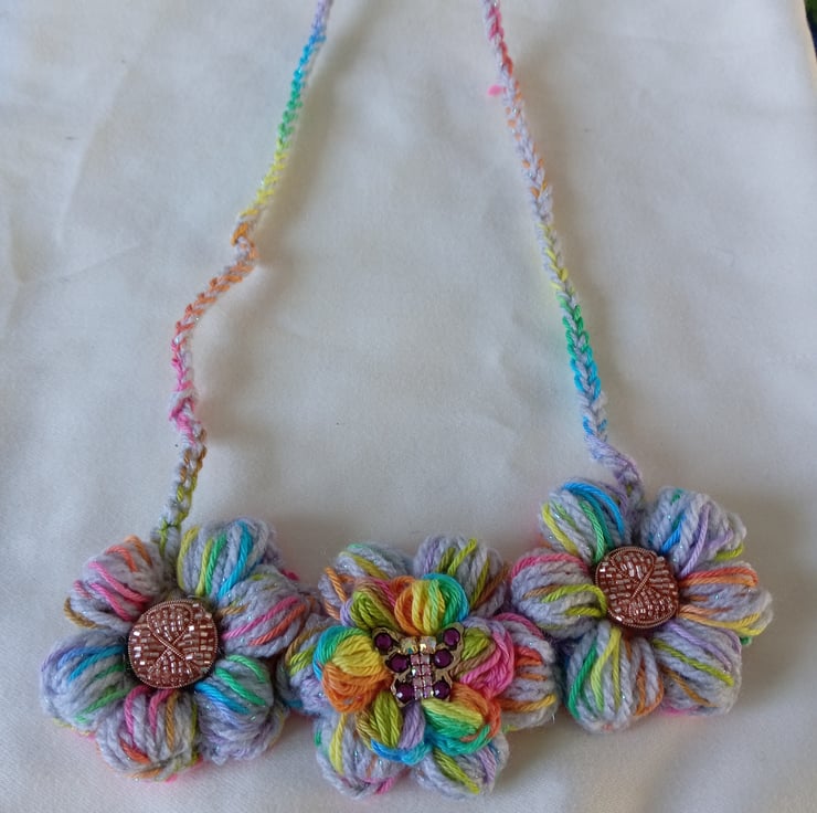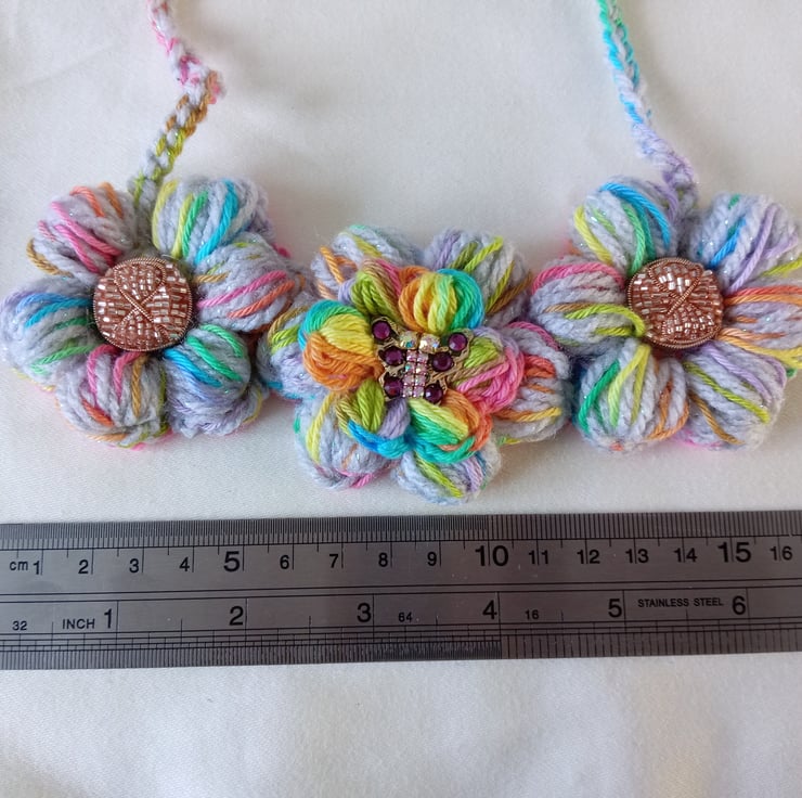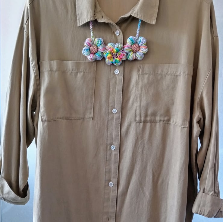 This is a very pretty crochet puff flower necklace. It's a big statement look but is very comfortable to wear.