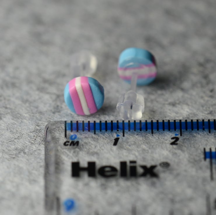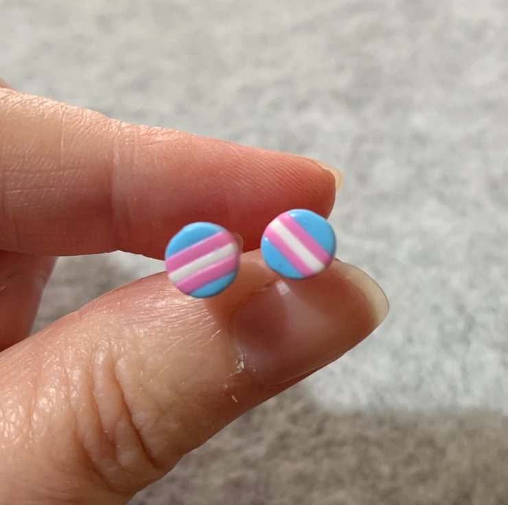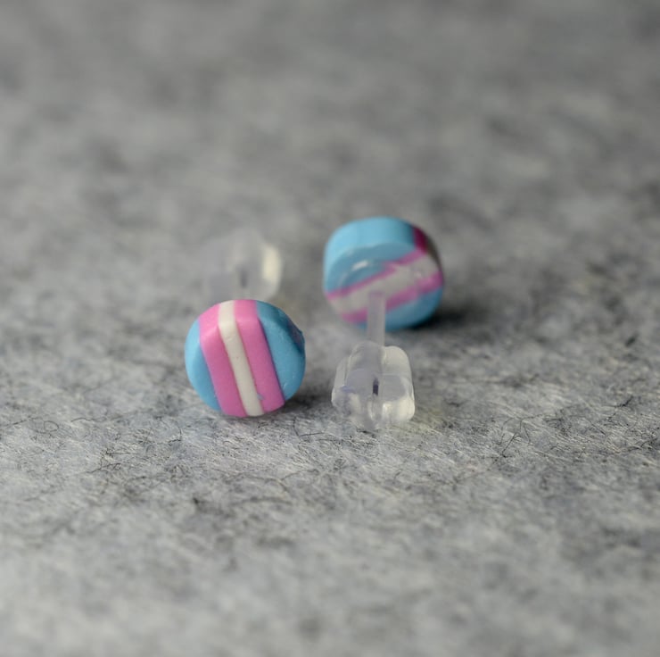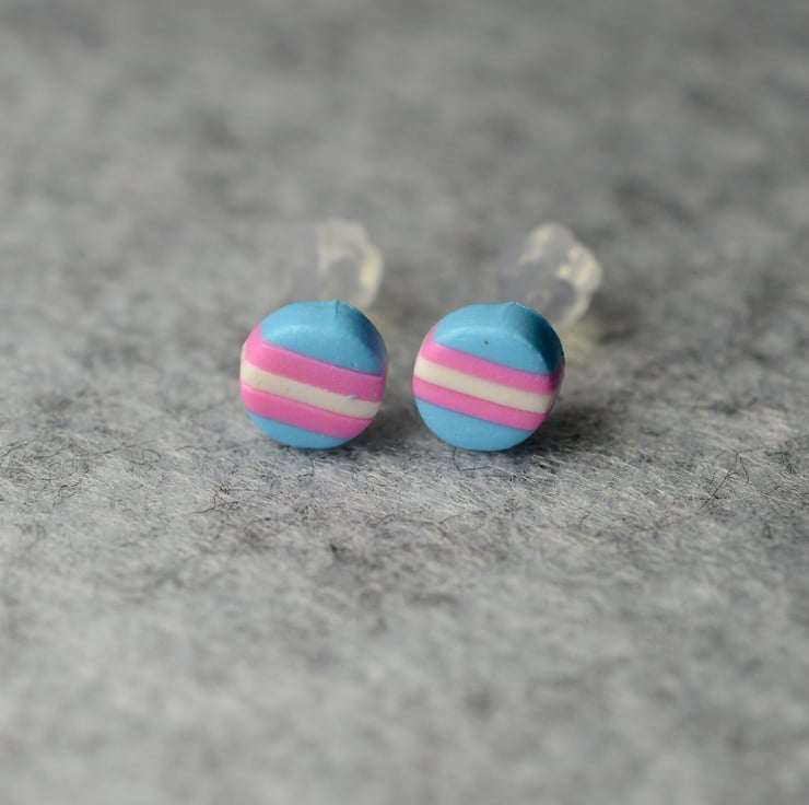 A pair of small trans pride earrings made from polymer clay, and on plastic posts.