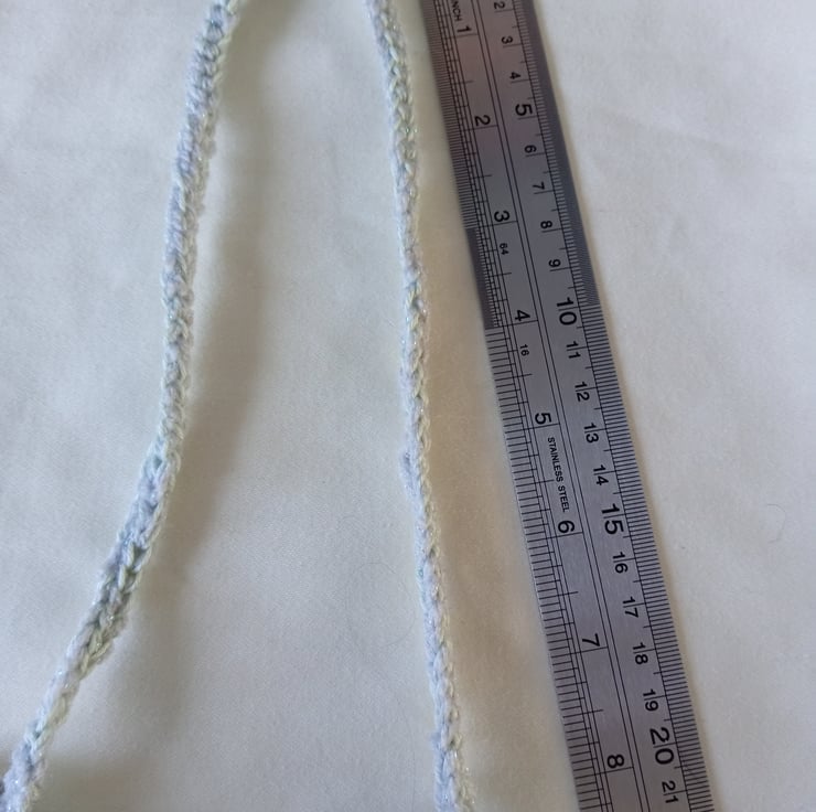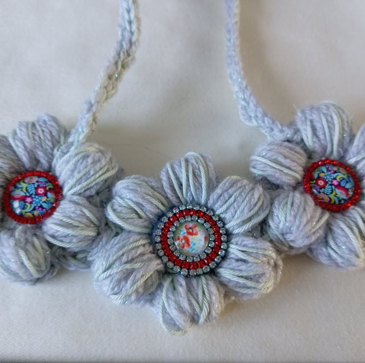 This is a very pretty crochet puff flower necklace. It's a big statement look but is very comfortable to wear. It is a mix of silver grey acrylic yarn with a soft pale aqua cotton.