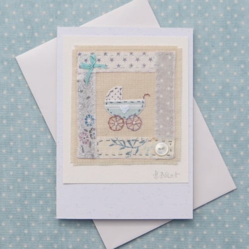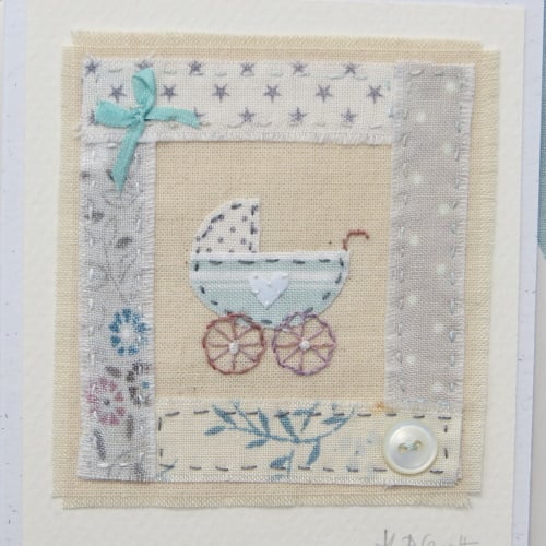 Designed to celebrate the arrival of a new baby the miniature hand-stitched applique pram is bordered by pretty fabrics with a vintage mother of pearl button stitched into the design as well as a hand tied silk ribbon bow at the top. Hand embroidered details complete the miniature applique design. I think the aqua and neutral tones would make it suitable for a boy or girl.