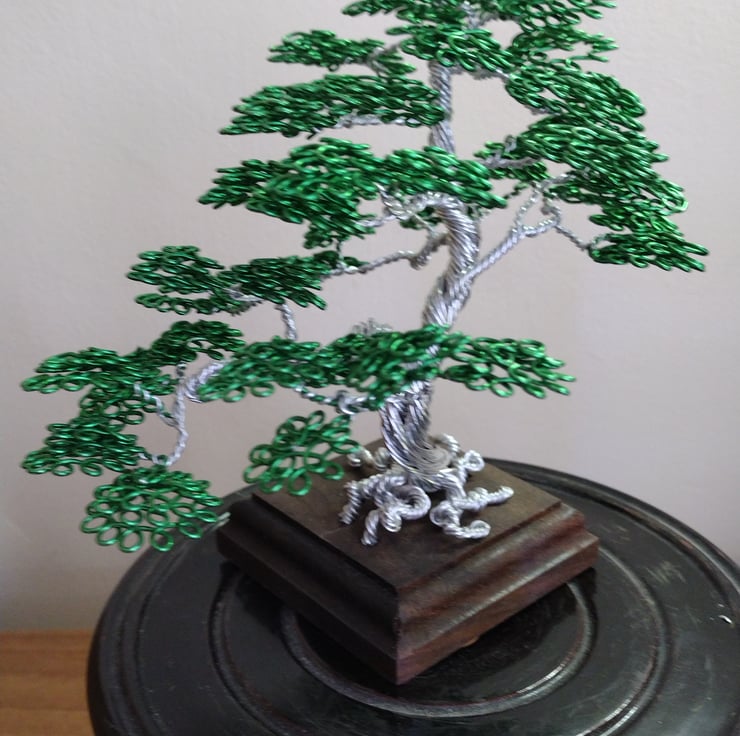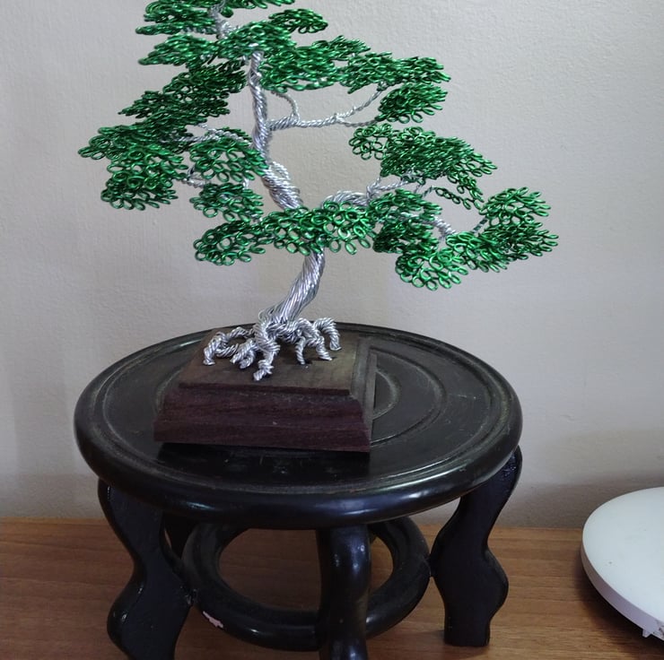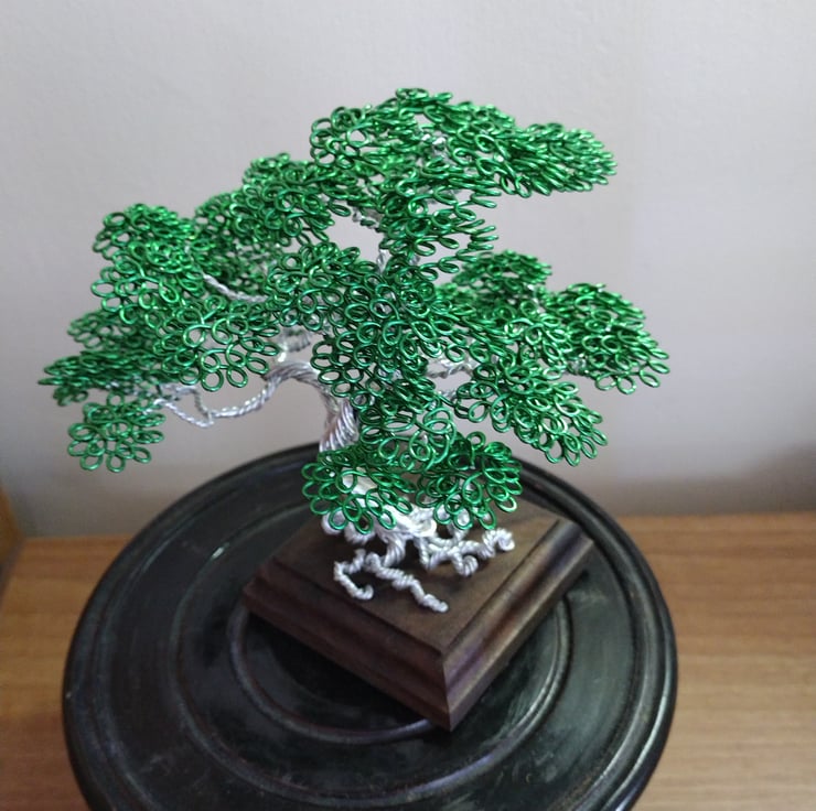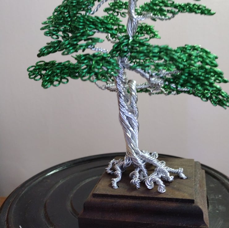 Although this tree,it is a beautiful item to have anywhere, house or work, it's made in an informal upright bonsai style and is made of 1,0, mm aluminium wire, with the trunk and branches in silver, they have been carefully twisted to give the required effect, the leaves are of green wire and rolled in a way to get the required effect,it shows that it is an old tree with the roots being exposed, the tree is standing on a genuine mahogany plinth, it has padding underneath to stop scratching on delicate surfaces, it's a perfect little gift for anybody and everyone as it will take the eye as soon as you see it. H,17, mm,L,17,mm W,12, mm.