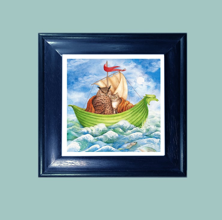 This is an open edition print, unframed, made from my original water colour illustration of the owl and the pussycat. The print has a white border and the image size is 8ins, the paper size is A4. It is sold unframed without a mount. It has been printed onto good quality archival acid free paper using Canon Chromalife 100 plus inks for enhanced longevity.