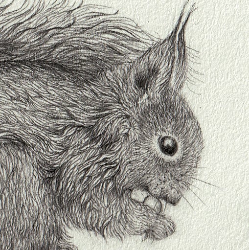 I enjoyed drawing this young red squirrel, I wanted to capture the qualities of the animals coat and bushy tail. Sightings of red squirrels are quite rare in my part of the world but I was able to observe them in Bavaria and Austria where their habitats are less threatened.