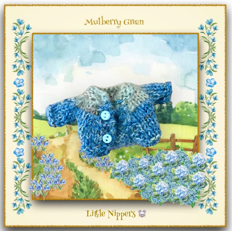 A sweet little blue yoked cardigan, with two tiny buttons, made specially to fit the Little Nippers.