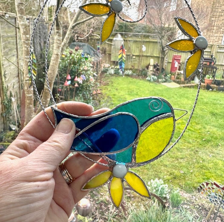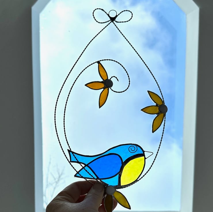 The glass used for the blue tit is a bright blue corella glass and yellow hammered glass for the breast. I have used a yellow sea glass and iridised yellow sea glass for the flower petals and small white nuggets for the centre. Twisted tinned wire has been used for the surround and scroll for the bird to sit on.