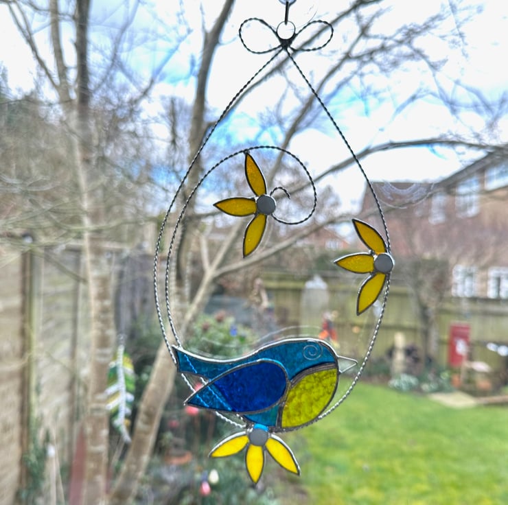 Blue tit suncatcher made in beautiful stained glass by Carole’s Glass.