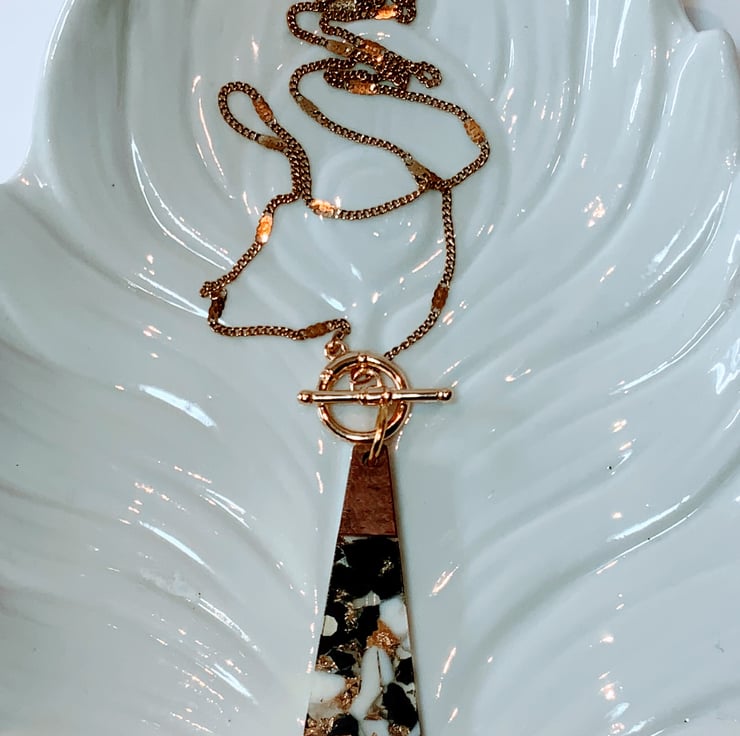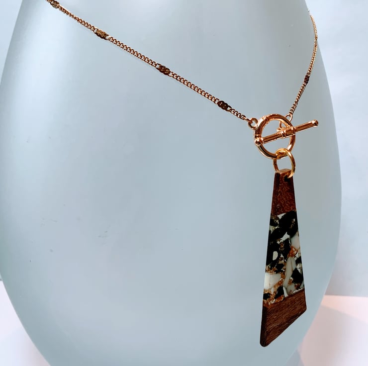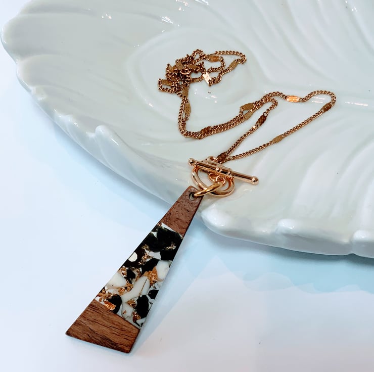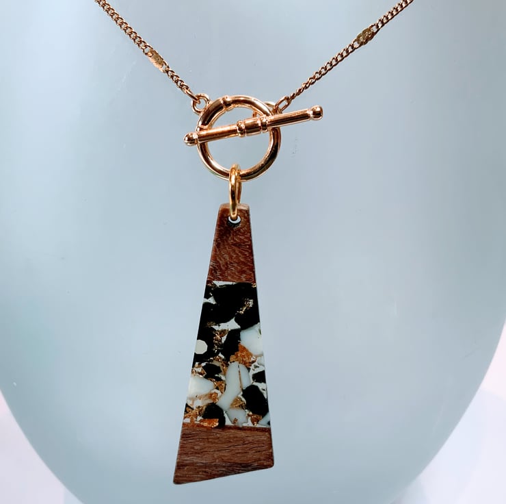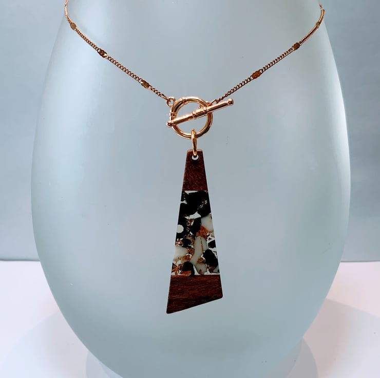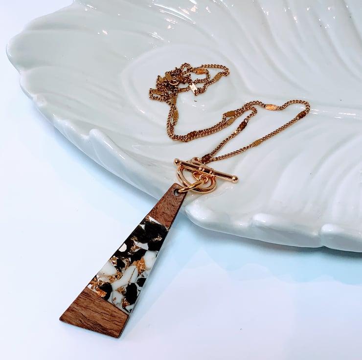 A modern geometric design pendant in rich dark walnut wood and transparent resin that is filled with black and white gems and gold foil