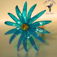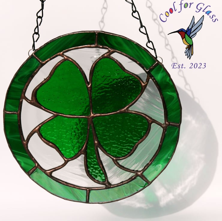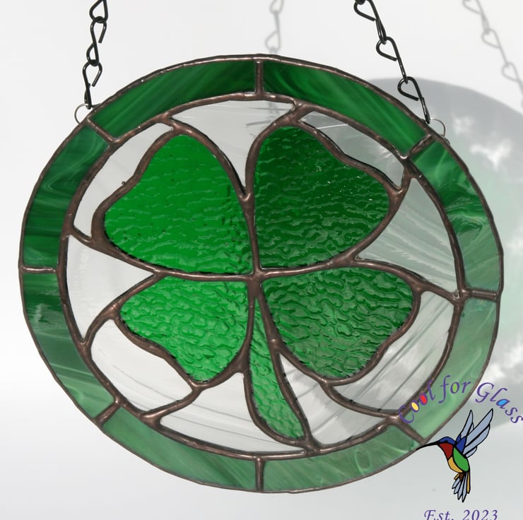 Encased in a circular frame with a soldered rich green, with white wisps, semi opaque glass border, the shamrock is surrounded by a clear grey baroque glass which complements the green without overpowering it. Perfect for hanging in a window or any sunny spot or even against a light coloured wall, this sun catcher symbolizes good luck and prosperity. Handcrafted with care using the copper foil technique made popular by Tiffany lamps.