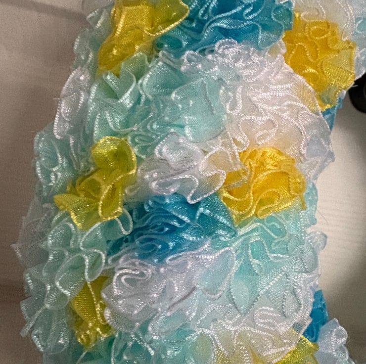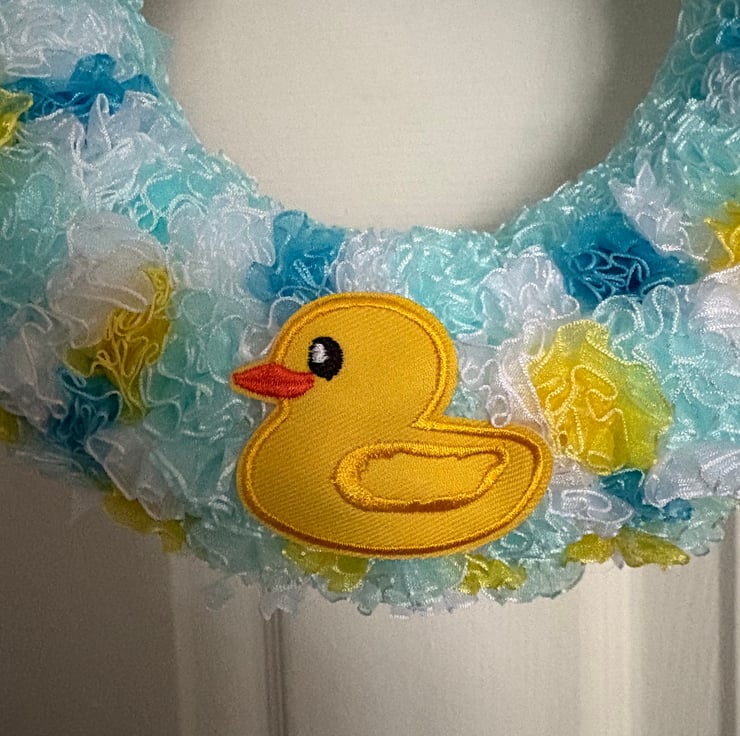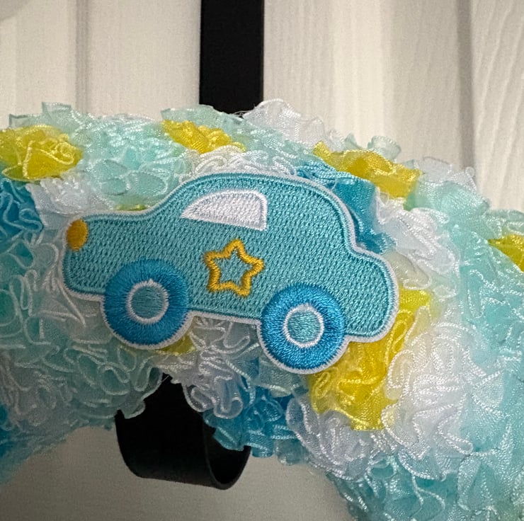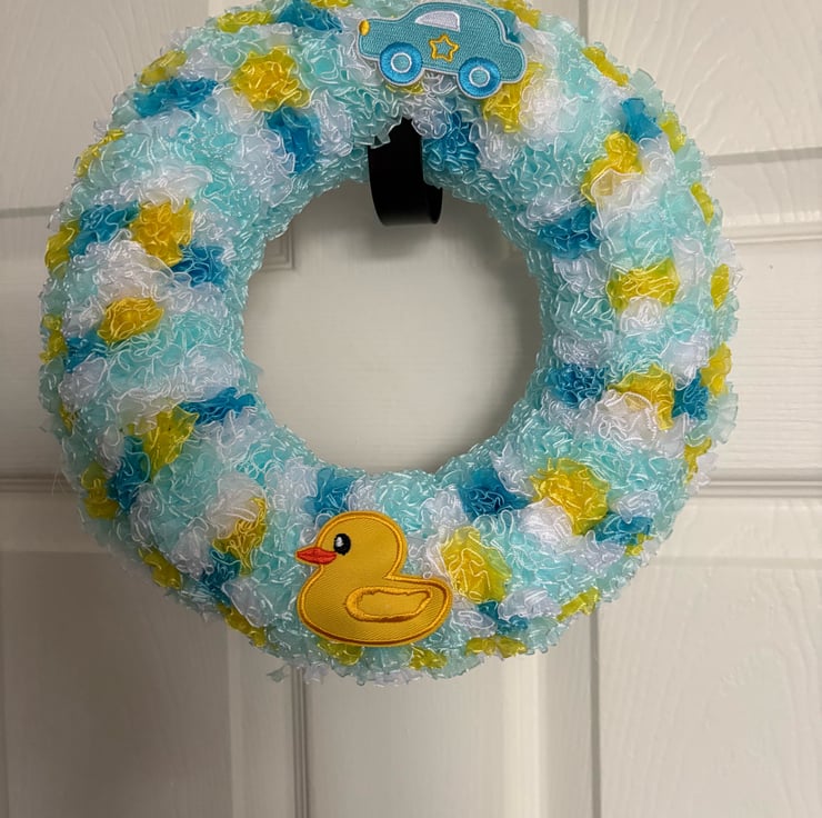 Be different when buying a baby shower gift. This wreath is hand decorated using chiffon Pom Poms. Then carefully added baby boy decorations.