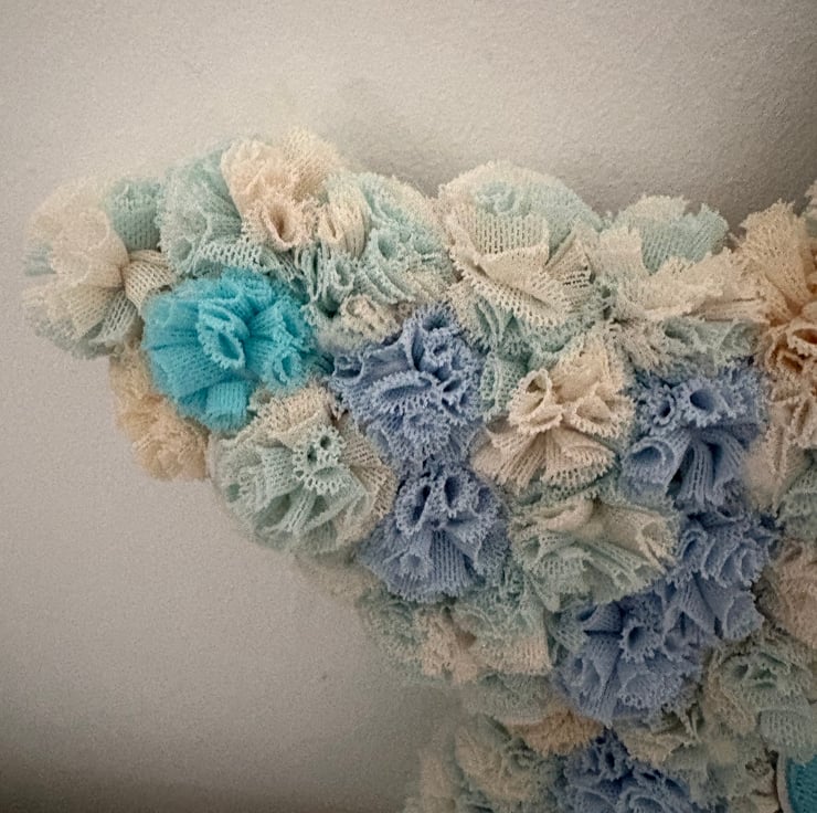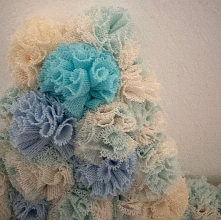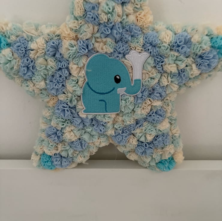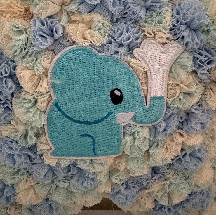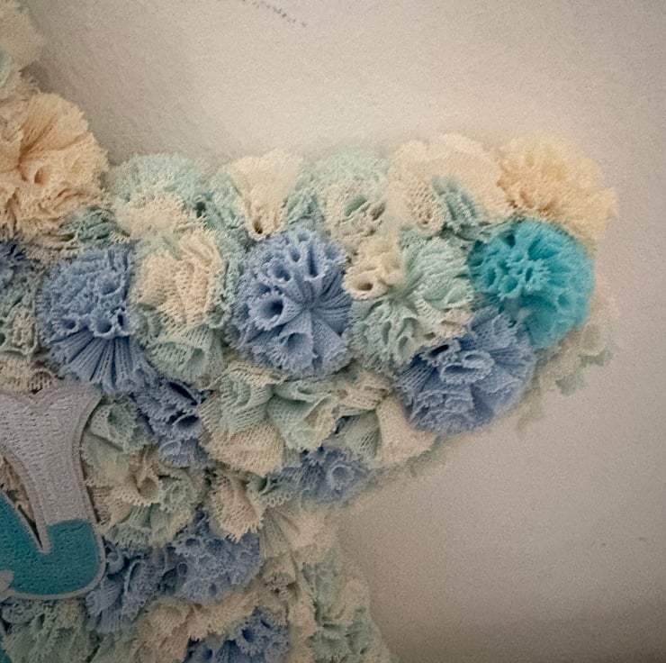 Gorgeous baby boy shower wreath. Decorated using scrunchy Pom Poms.