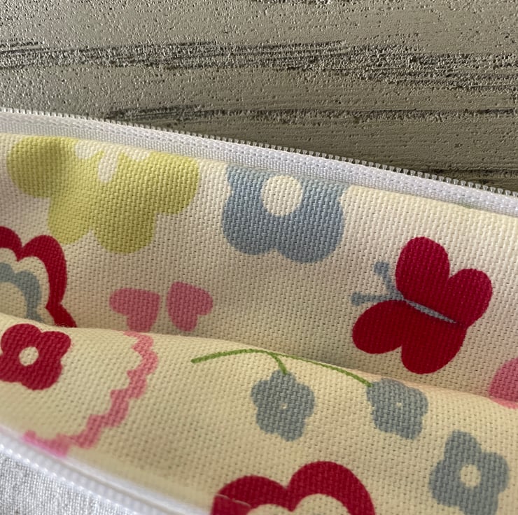 The floral lining in a curtain weight fabric has a white background and the flowers and leaves of the design are in shades of blue, pink, red and green.