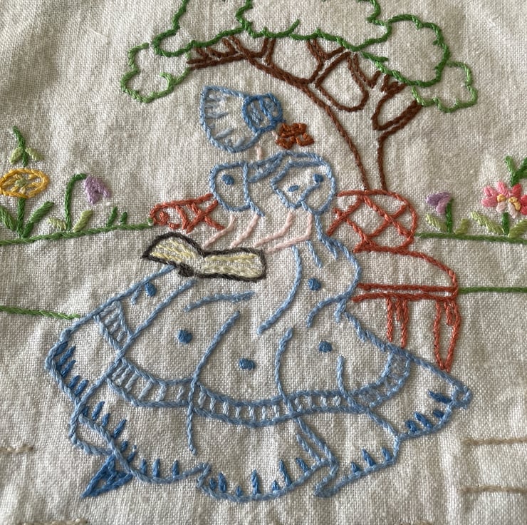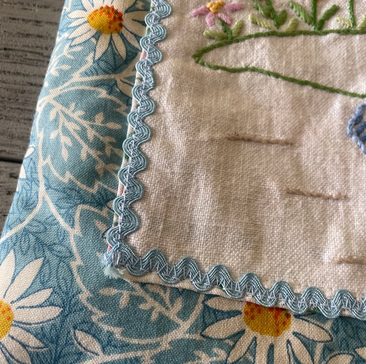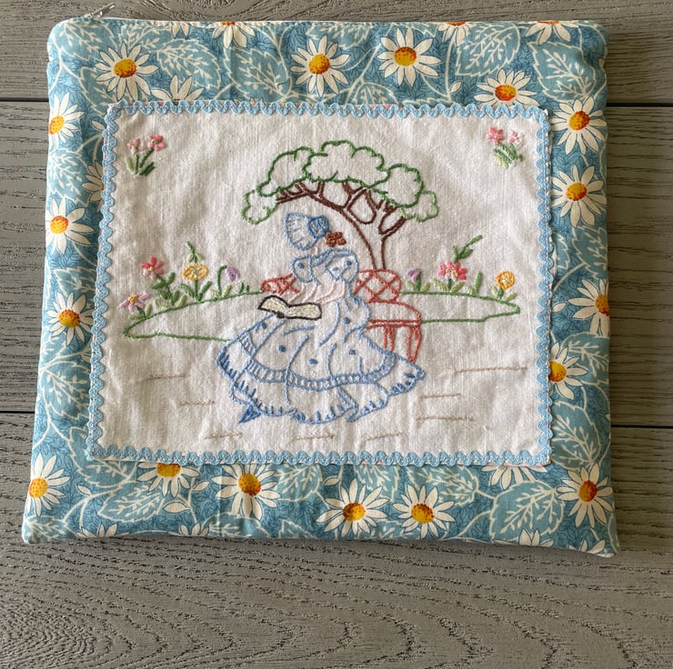 This hand embroidered scene of a crinoline lady sitting in a garden has been recycled and sewn onto the front of this fabric zipped pouch. The main bag is made from a blue floral cotton fabric with white daisies with gold centres and blue and white leaves. The original blue ric rak matches the colour of the bag.