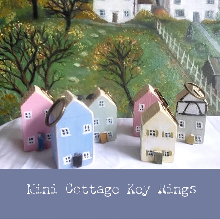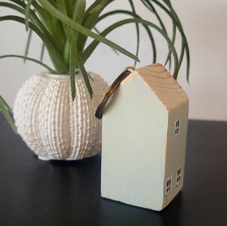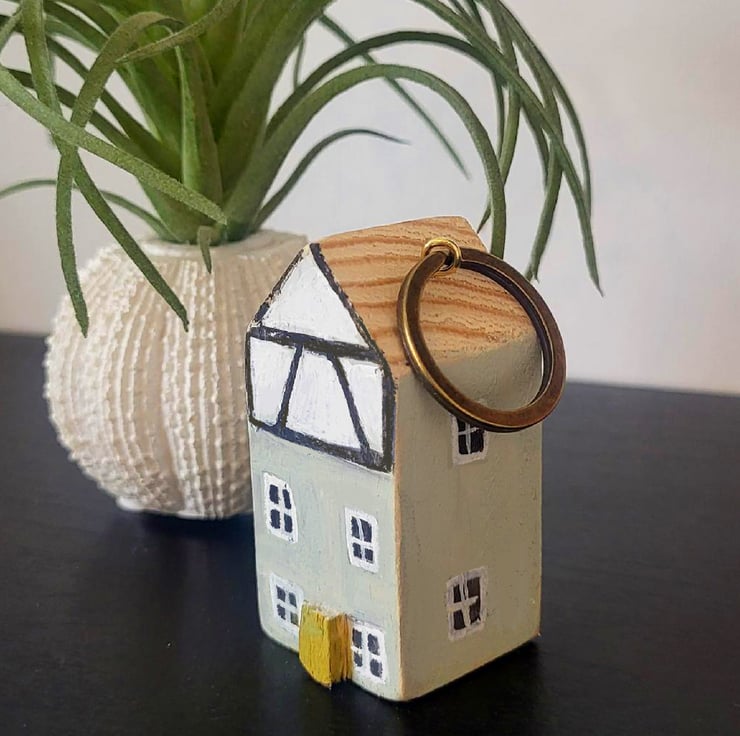 Handmade, little wooden Tudor house, keychain / key ring. The key ring is painted and sealed with a light, satin varnish after sanding back to create a weathered, shabby effect, exposing the wood beneath. The door is made from reclaimed wood. The key ring has a small gold eyelet to hold the antique brass ring securely.