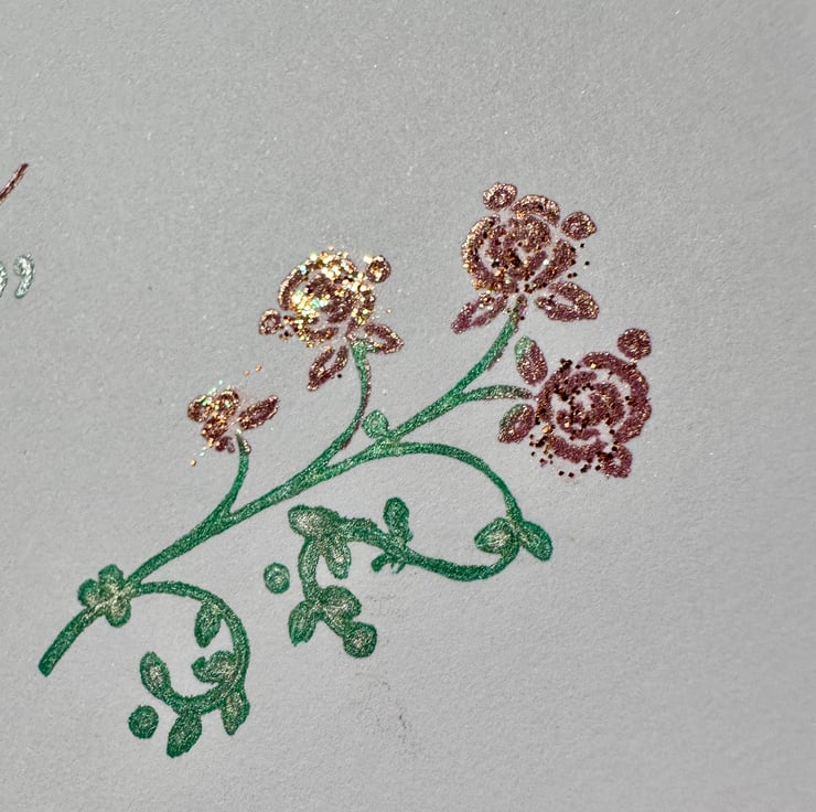 Beneath the text “you are loved” is in the same pearlescent ink with floral embellishments, the stalks in metallic green ink and the flowers with added sparkle.