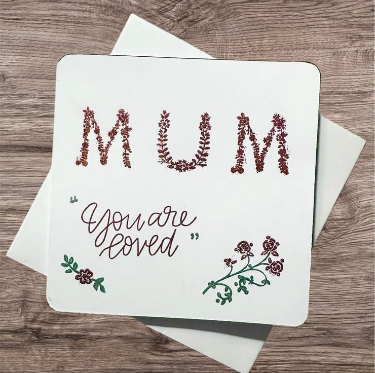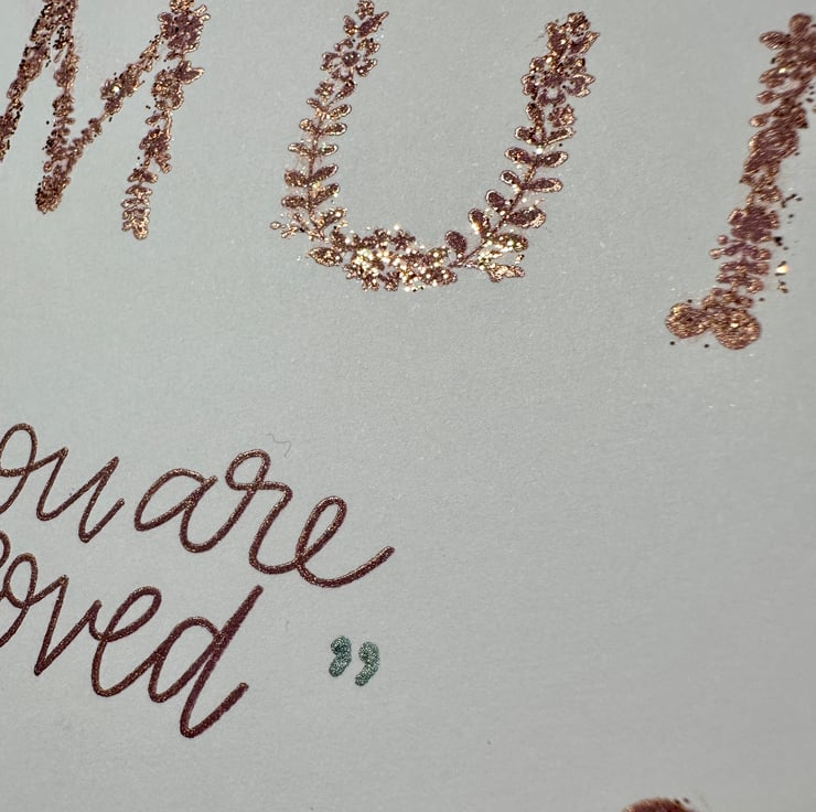 A beautifully delicate floral text makes up the word Mum in a pearlescent coppery red ink overlaid with sparkle.