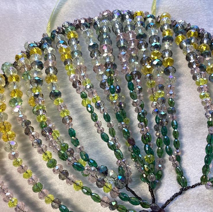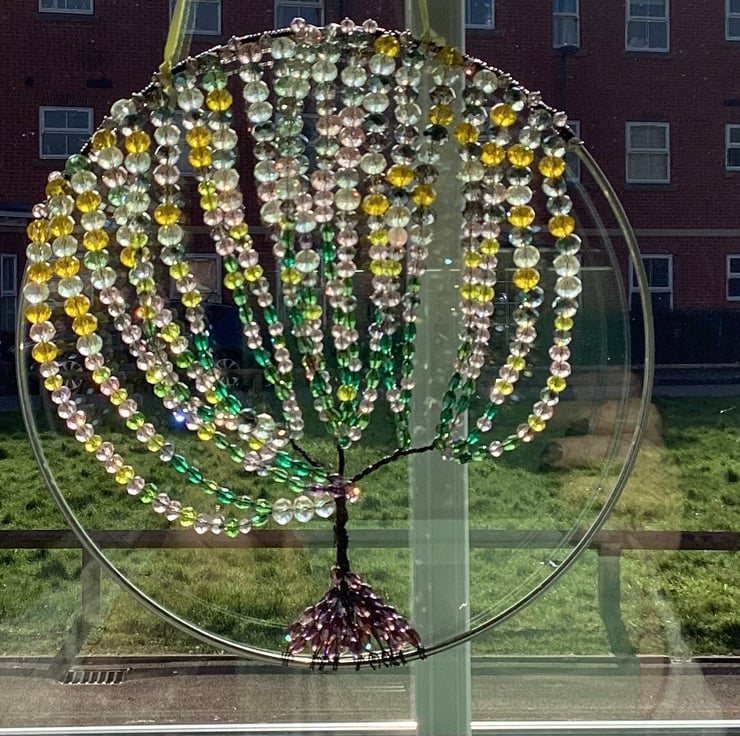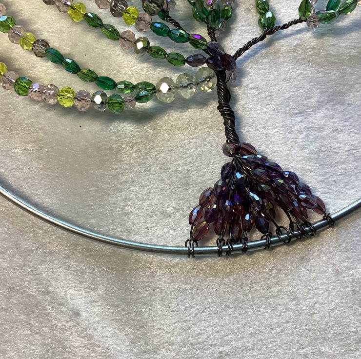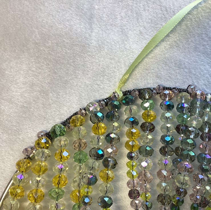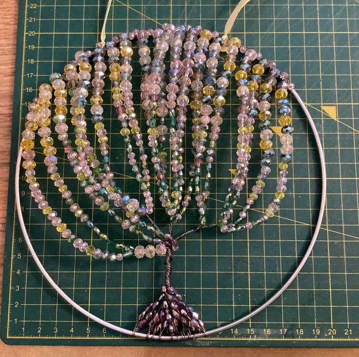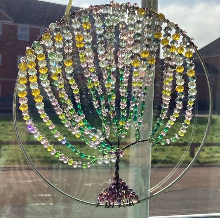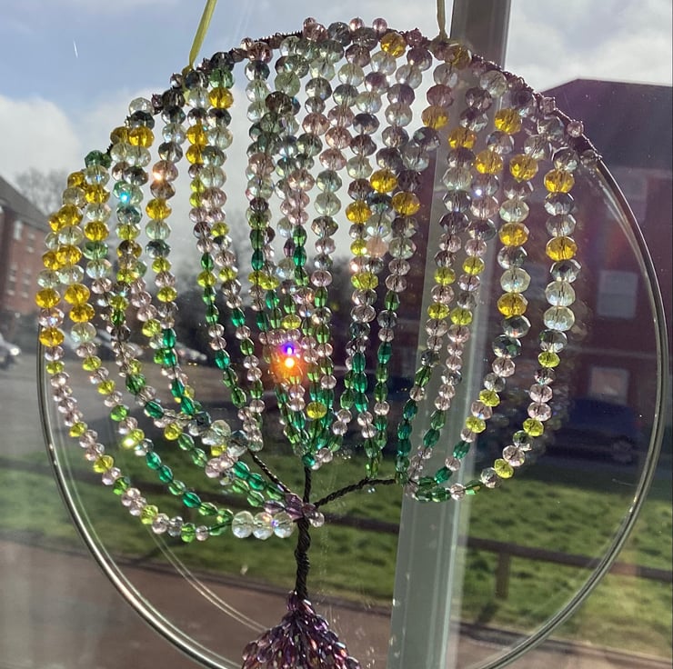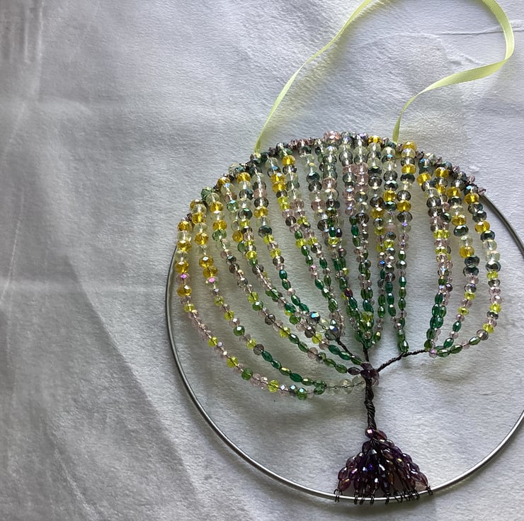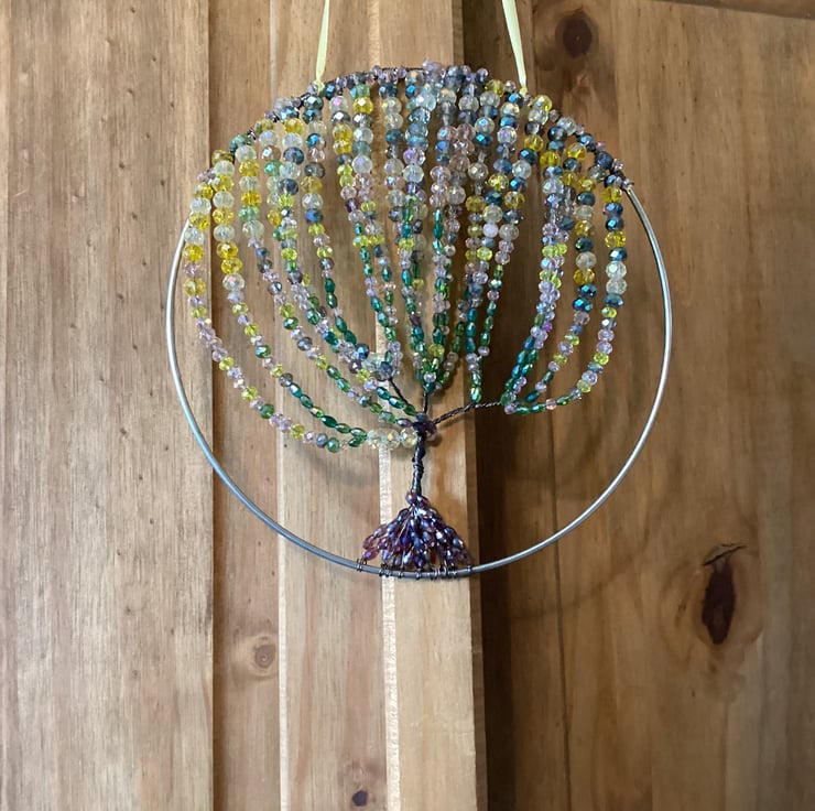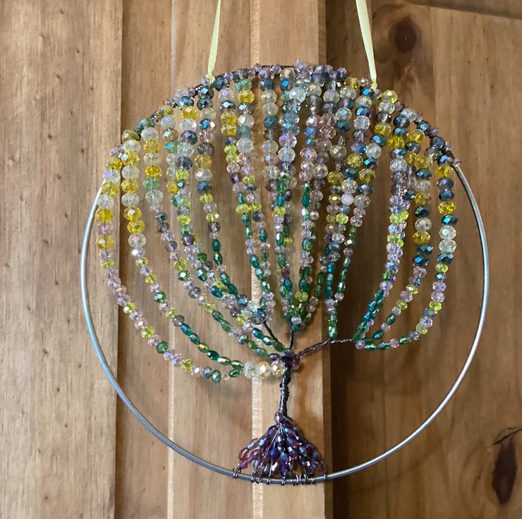 This is a large sun catcher, with silver metal ring. I’ve used different colours and sizes beads