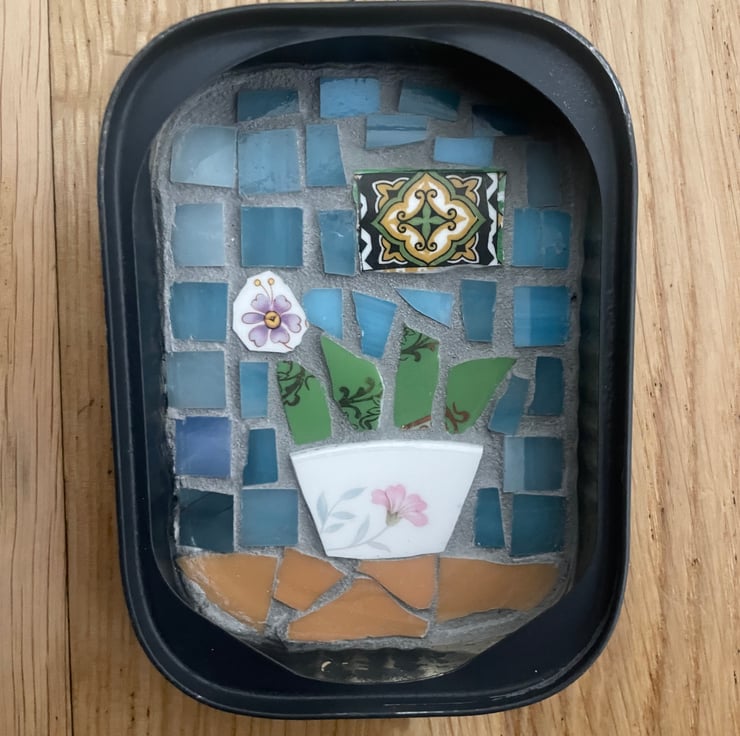 Mini mosaic in sardine tin. Plant in pot.Unique artwork made in East Sussex with lots of love. Made out of broken china plates and little mosaic squares. Would make a lovely gift and looks great in kitchen, hallway or any other room. With wire loop on the back for easy hanging options.