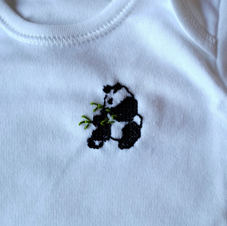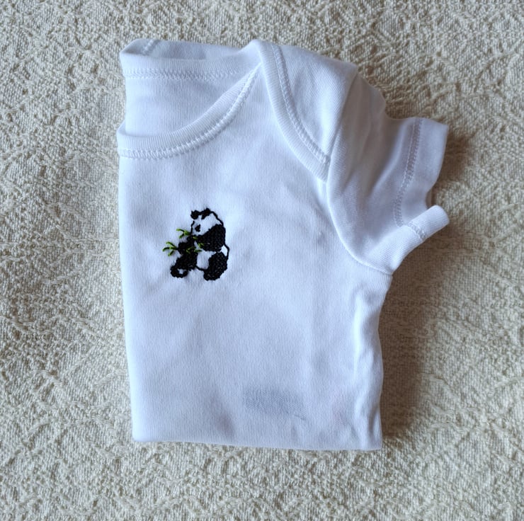 I have hand stitched a panda sitting eating bamboo on the left front of this soft white baby vest. As I never use a permanent backing fabric when embroidering kids' clothing, there is nothing inside to irritate your child's skin. The vest has short sleeves, an envelope neck and two press studs between the leg openings. It is all cotton and can be machine washed.